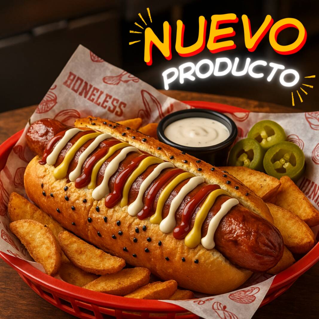 Nuevo producto! Hot Dog con salchicha de res de 21 cm! Pan elaborado especialmente, aderezos , jalapenos y PAPAS!