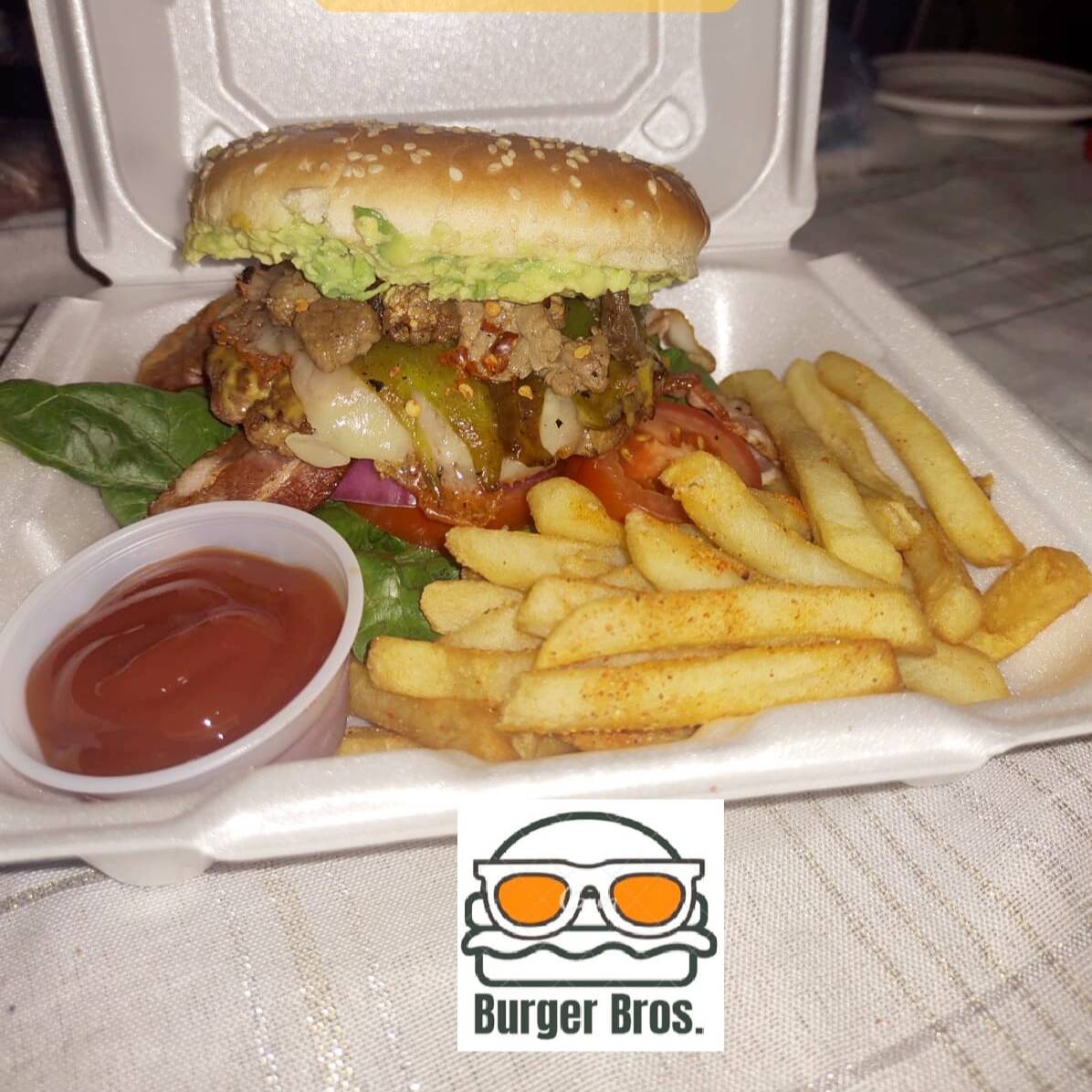 Con 2 carne caseras de res, queso americano, aguacate, tomate, cebolla, lechuga, tocino, queso Monterrey y carne asada (Incluye papas fritas).