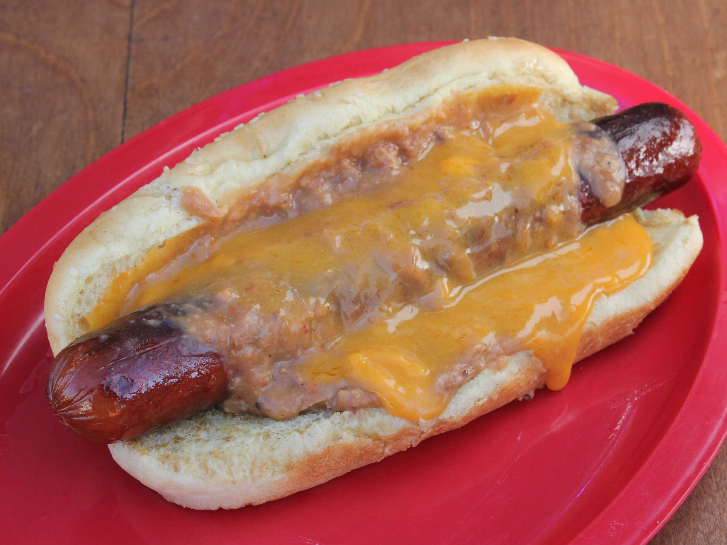 Salchicha longmont, tocino, frijoles puercos, queso nacho, aderezos verduras
