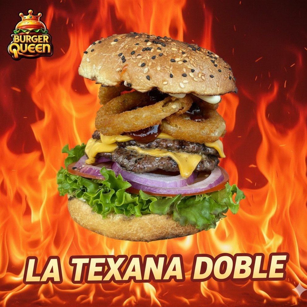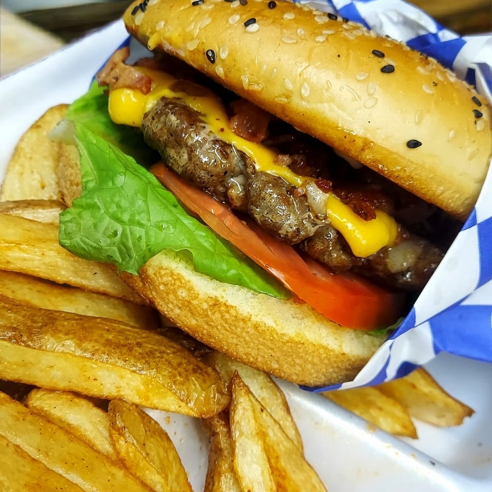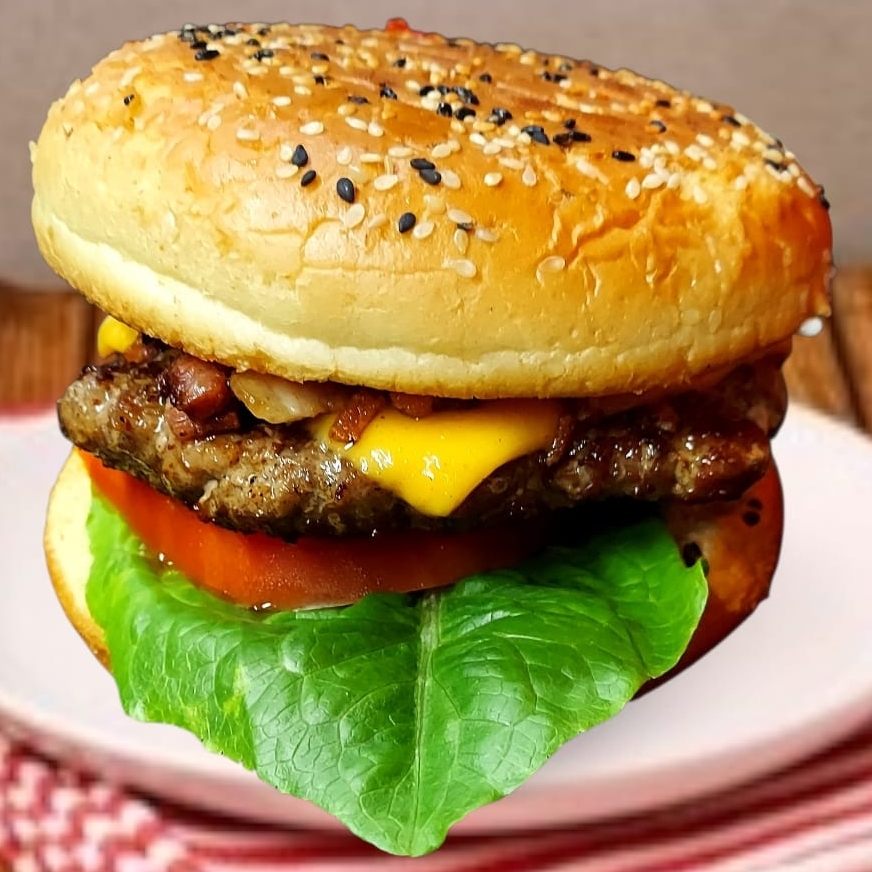 Pan ,carne, queso , tocino,aros de cebollas incluye papas