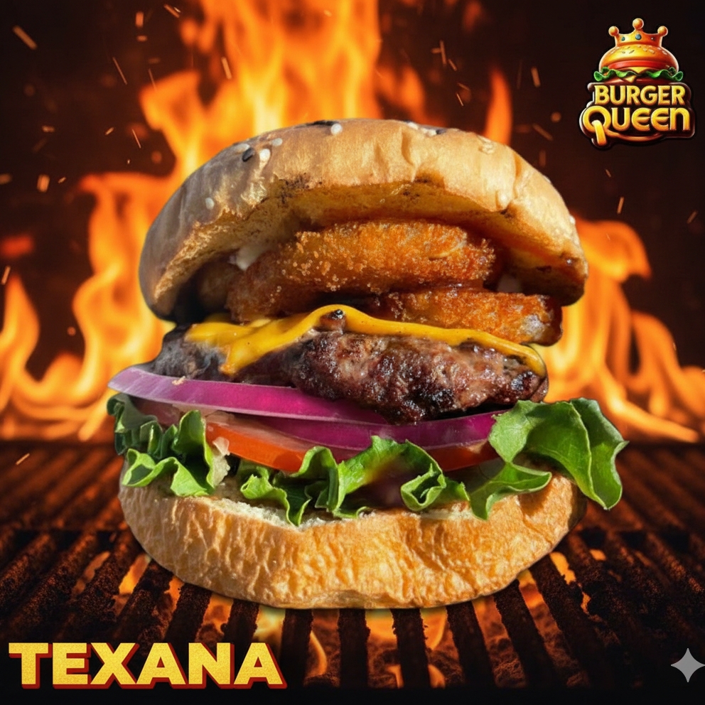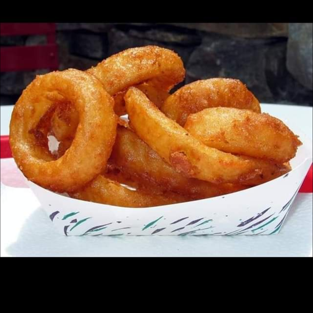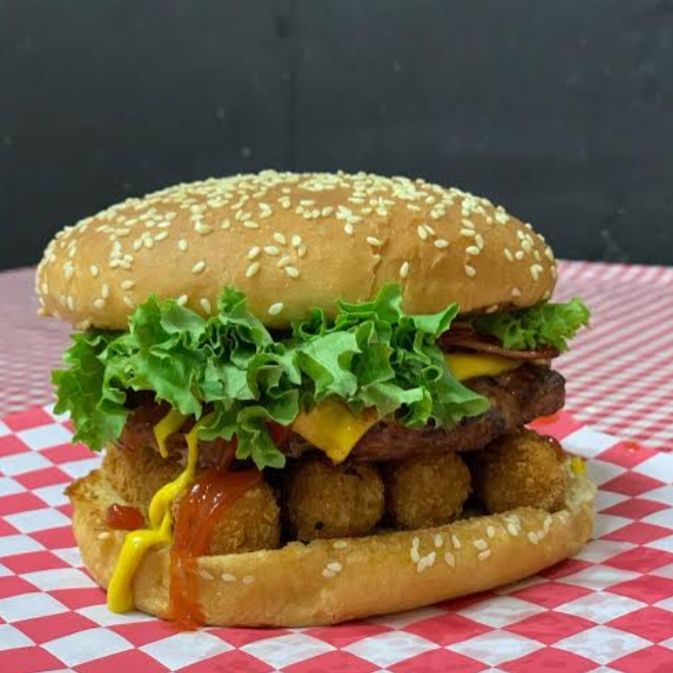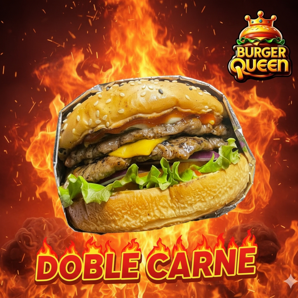 Pan ,carne, queso , tocino,aros de cebollas incluye papas