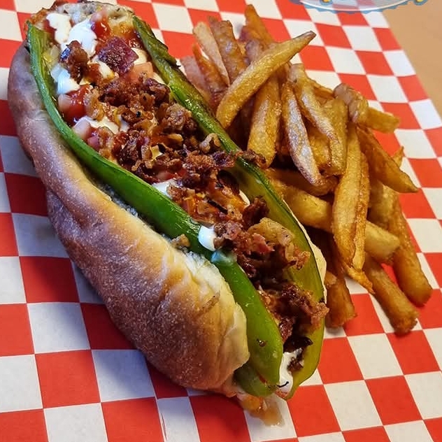 Salchicha longmont, tocino, verduras y aderezos media orden de papas