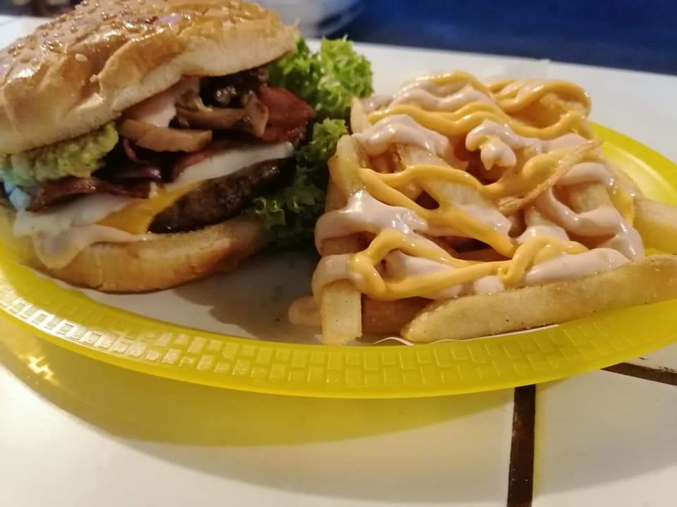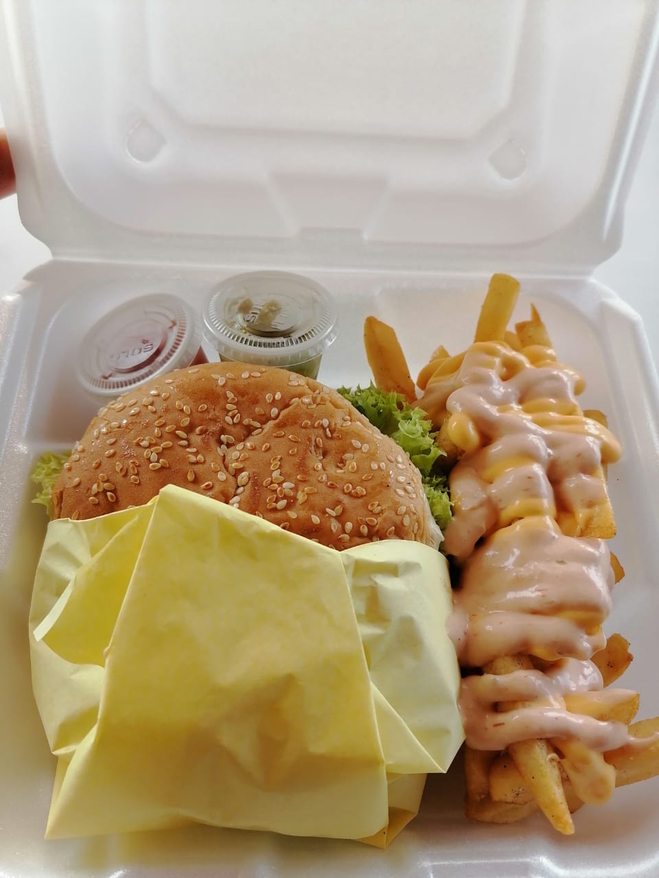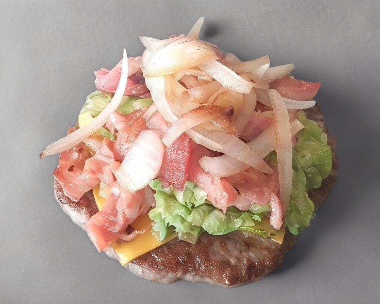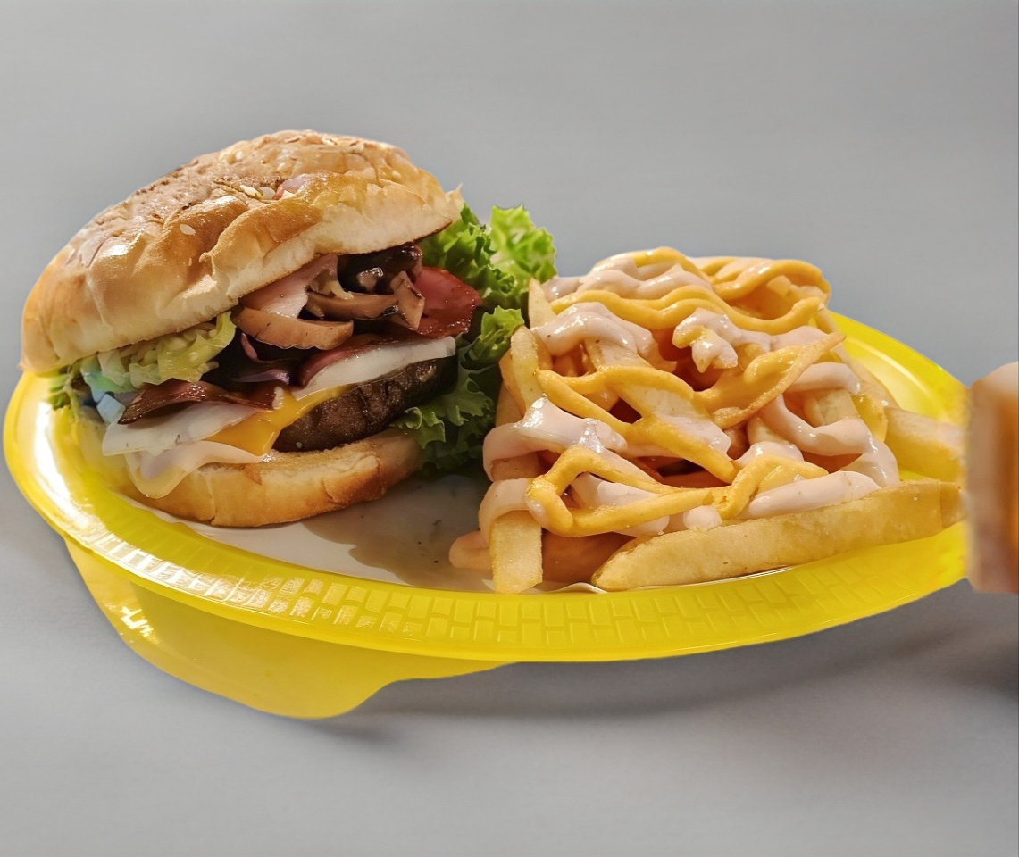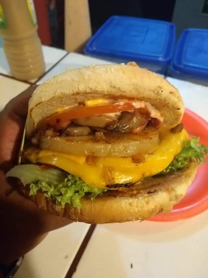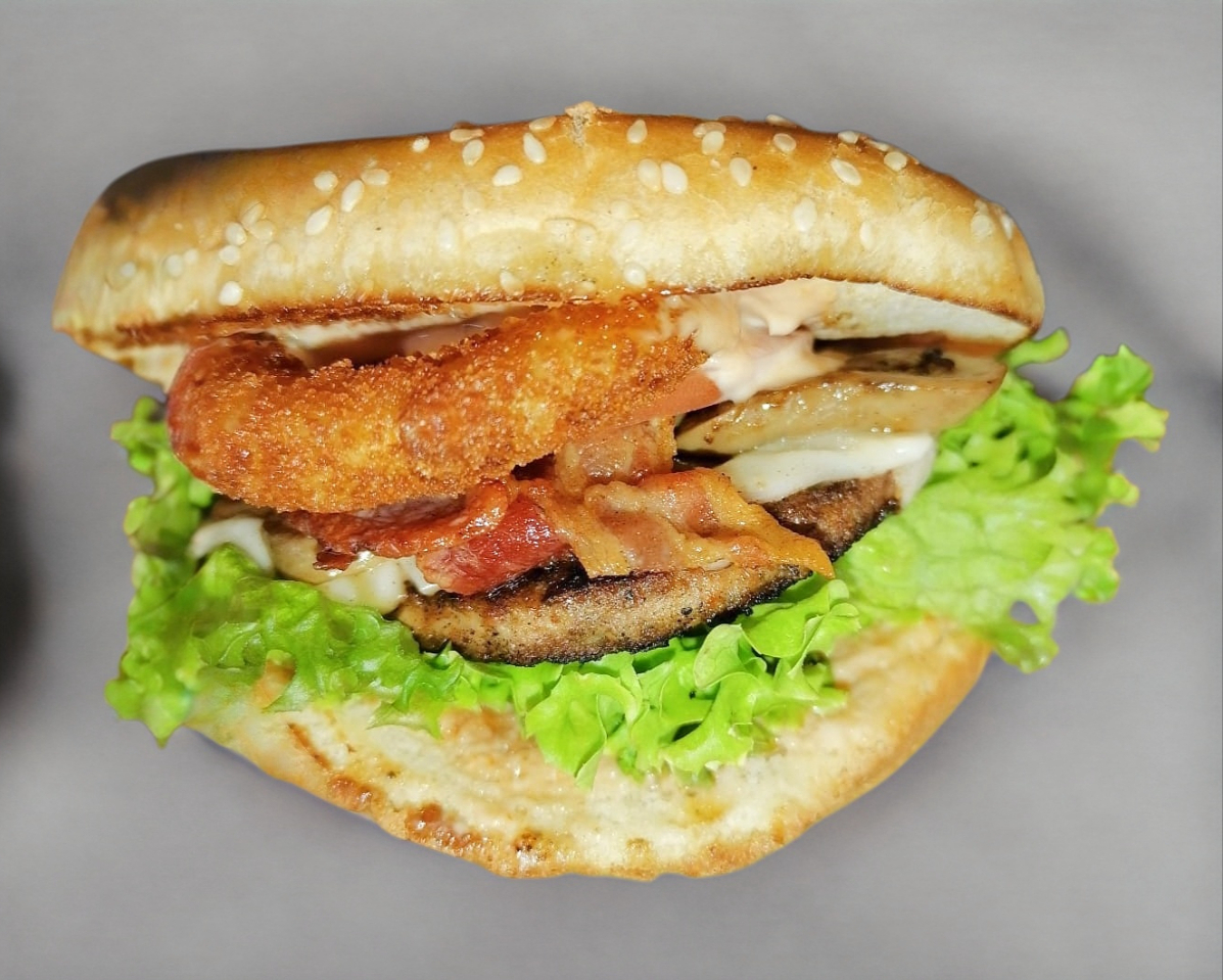 Carne de res, queso,lechuga, tomate, cebolla caramelizadas y aderezo de la casa.