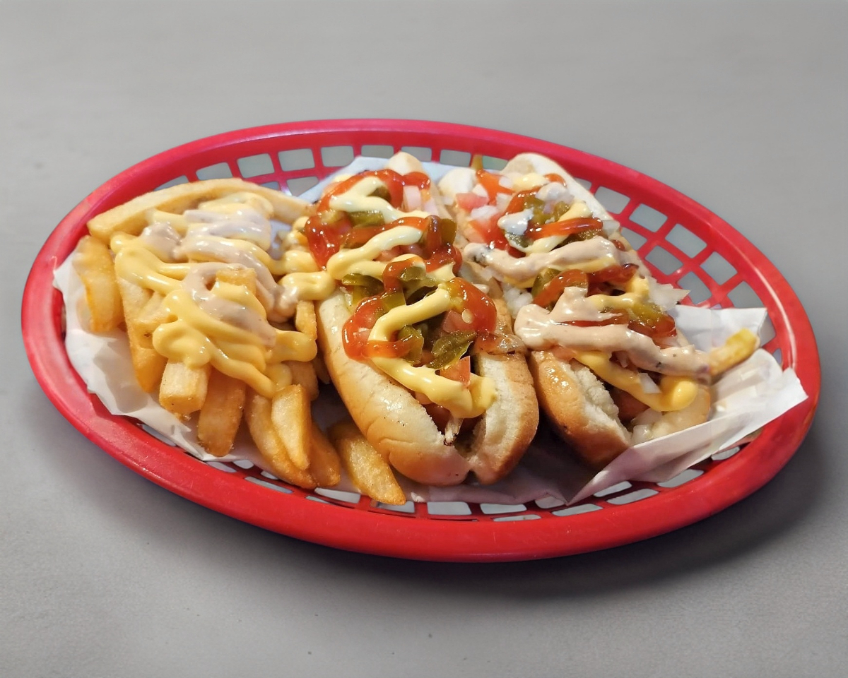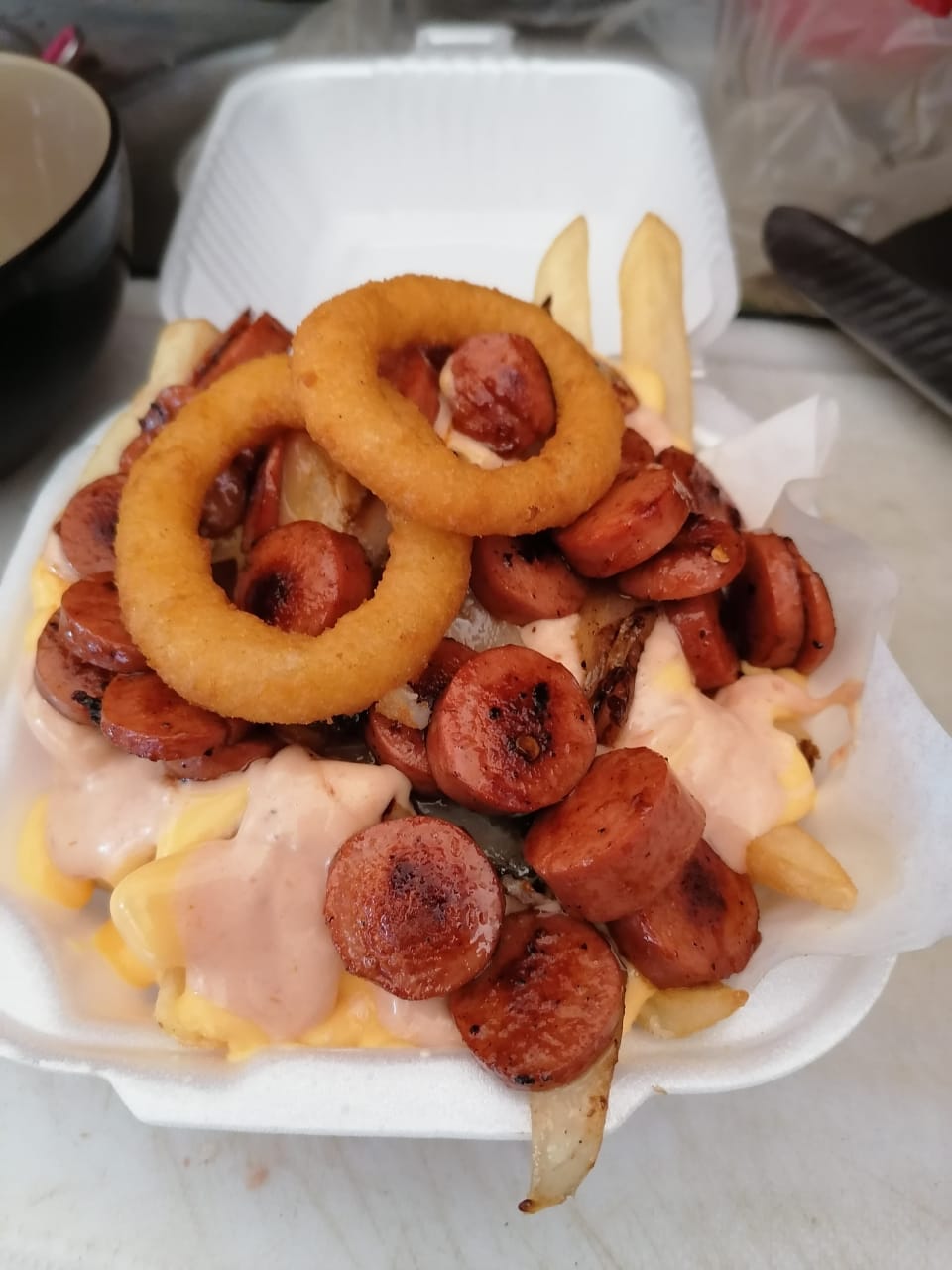Papas, salchicha asada, cebolla caramelizada, queso cheddar, aderezo de la casa, aros de cebolla..