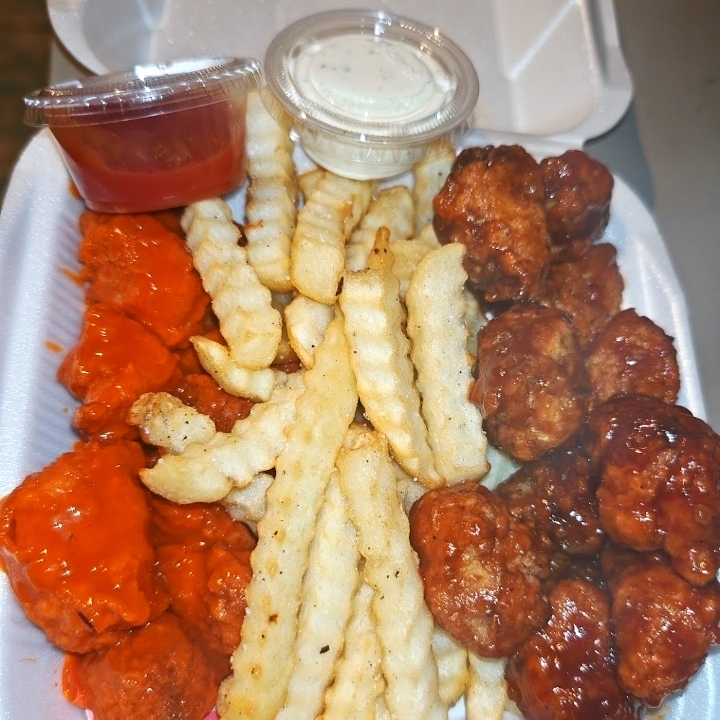 Boneless ( bbq o búfalo) con papas fritas katsup y aderezo ranch