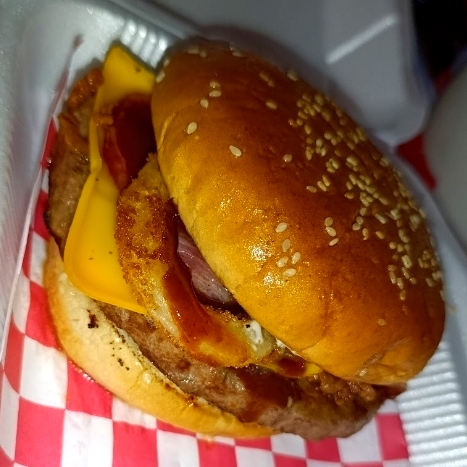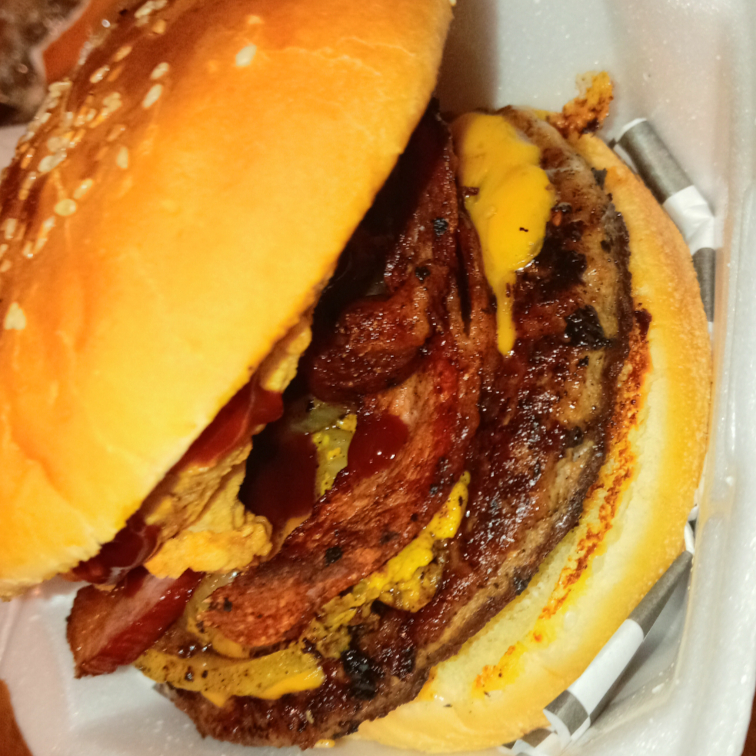 Carne arrachera, tocino, queso amarillo, aros de cebolla, salsa bbq y aderezo ranch