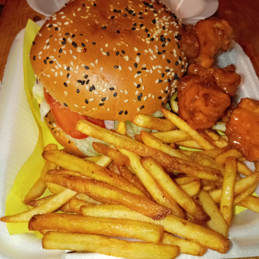 Hamburguesa Clásica, papas fritas, boneless (bbq o búfalo) y soda