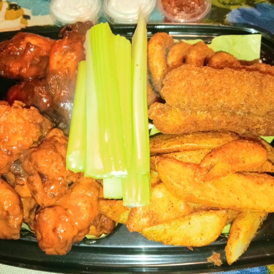 6 alitas, boneless, 1/2 orden de aros, 1/2 de papas sazonadas, 1/2 de dedos de queso, apio, ranch y katsup