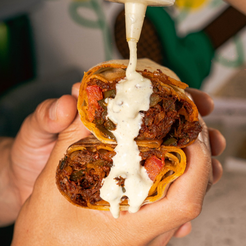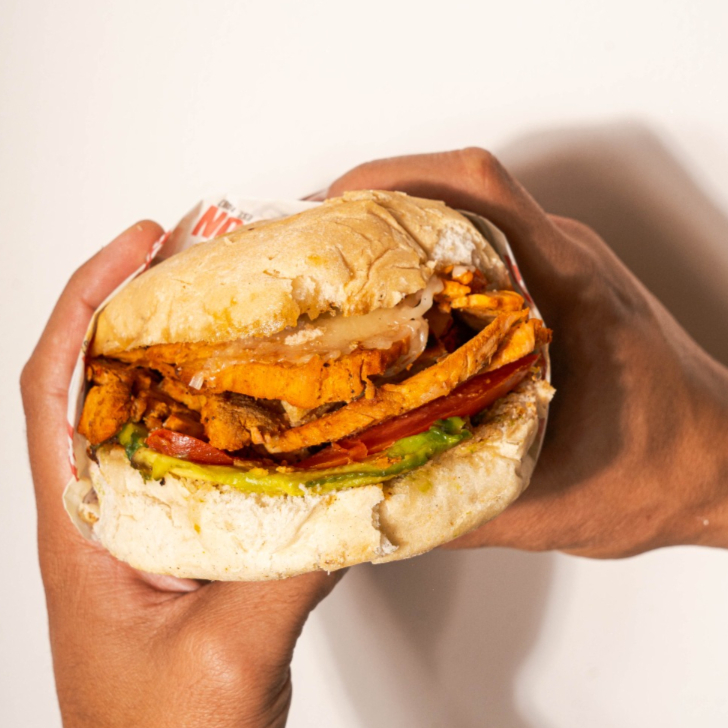 Carne deshebrada con chile morrón, cebolla y tomate (todas nuestras tortas y burros incluyen base de mayonesa, aguacate y tomate)