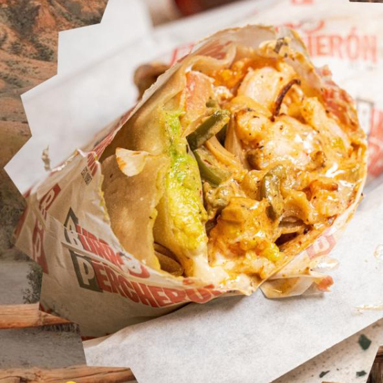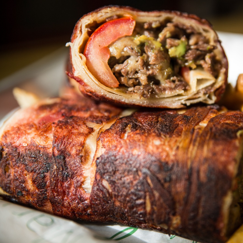 carne asada (350gr) con queso monterrey envuelto en tocino (todos nuestros burros y tortas incluyen base de mayonesa aguacate y tomate)