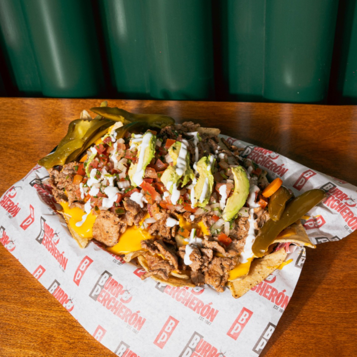 totopos con queso de nachos, carne asada con queso monterrey, pico de gallo, aguacate y un toque de crema
