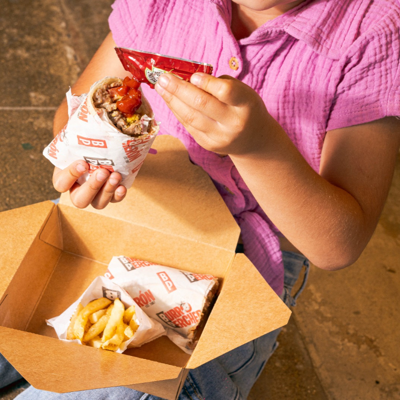 Burro tamaño pony (150gr) de carne asada con queso (todos nuestros burros y tortas incluyen base de mayonesa aguacate y tomate) orden pequeña de papas fritas y juguito