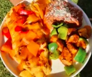 camarones rellenos de queso mozzarella y envueltos en crujiente tocino ahumado, montados en cama de arroz, ensalada de brotes y lechugas