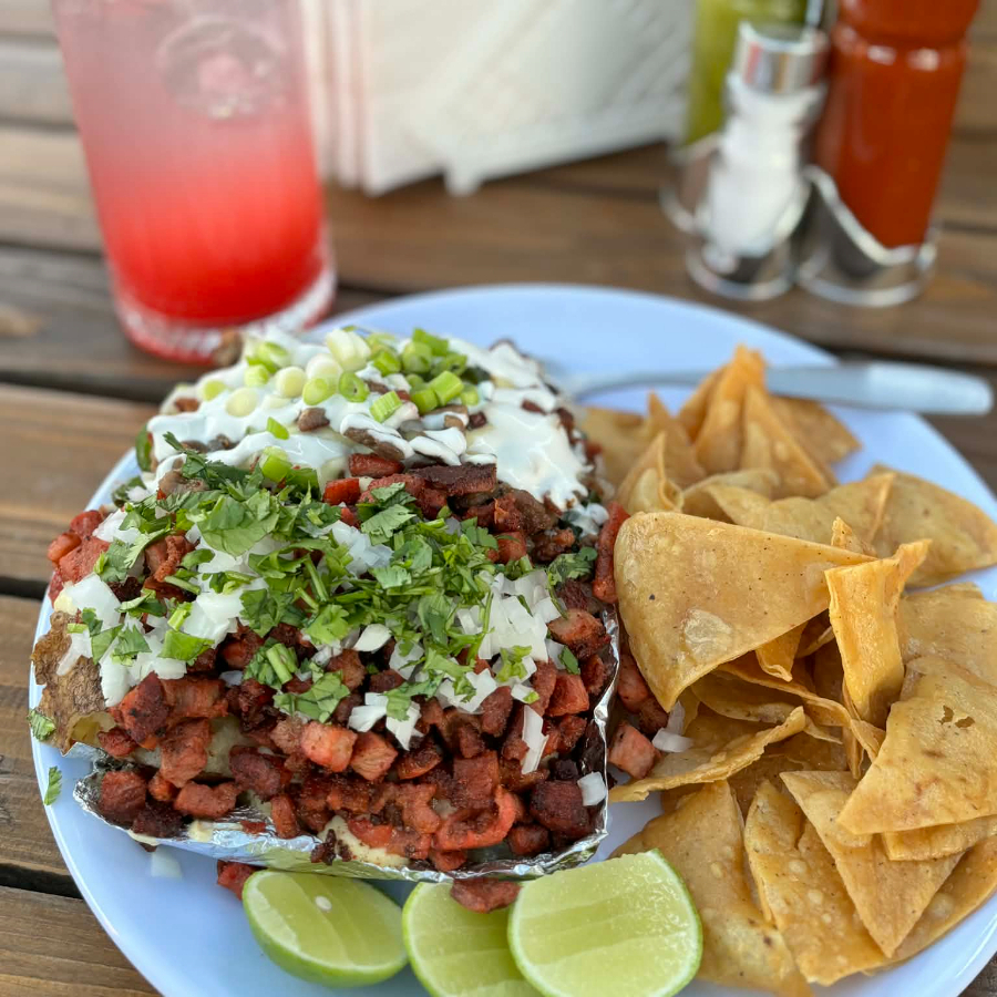 Papa rellena con queso, alambre y carne adobada, coronada con crema, aguacate y cebollin, acompañada de totopos y salsa.