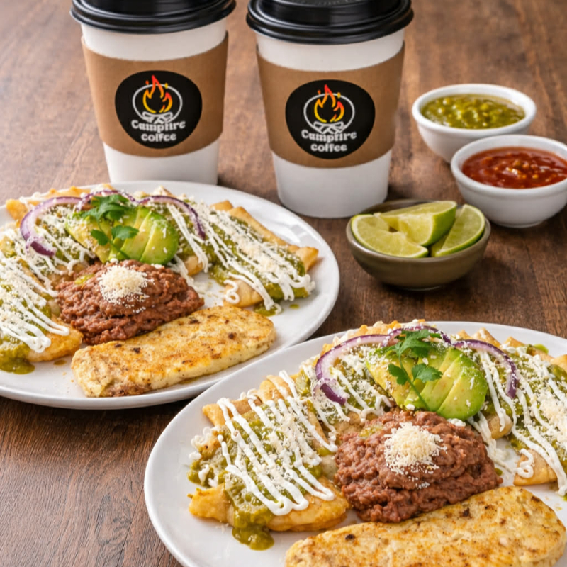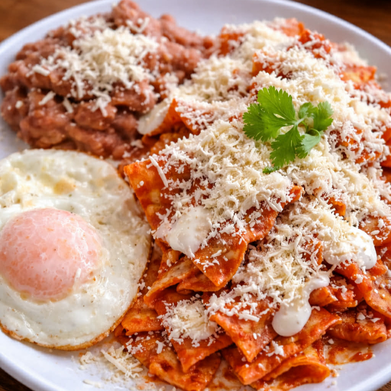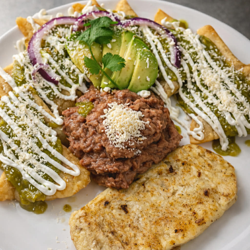 Chilaquiles bañados en salsa de su elección, Coronados con cebolla, crema y queso, acompañados de huevo y frijol.