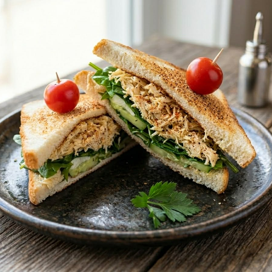 Sandwich de pollo deshebrado a la plancha, pan blanco, con queso panela, aguacate y espinacas.