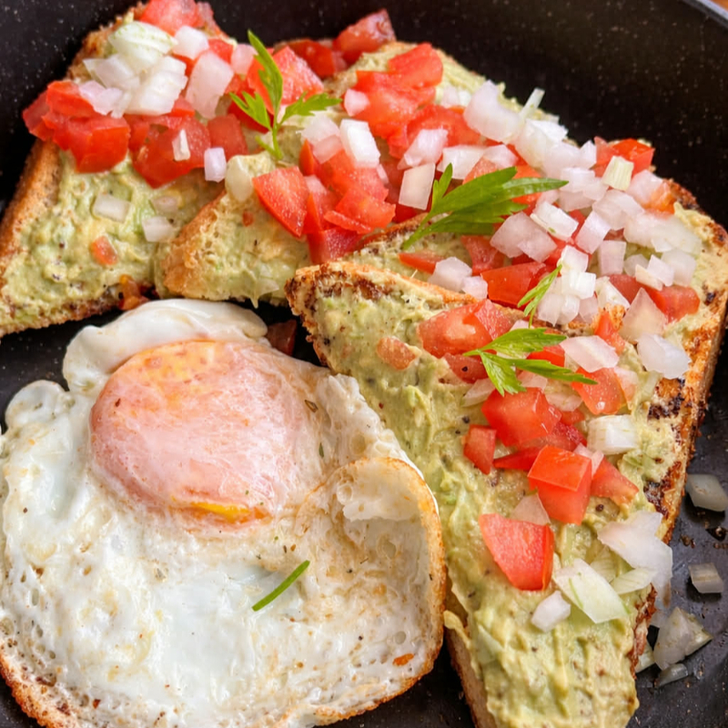 2 piezas de pan con guacamole, tomate, cebolla y acompañados de un huevo.
