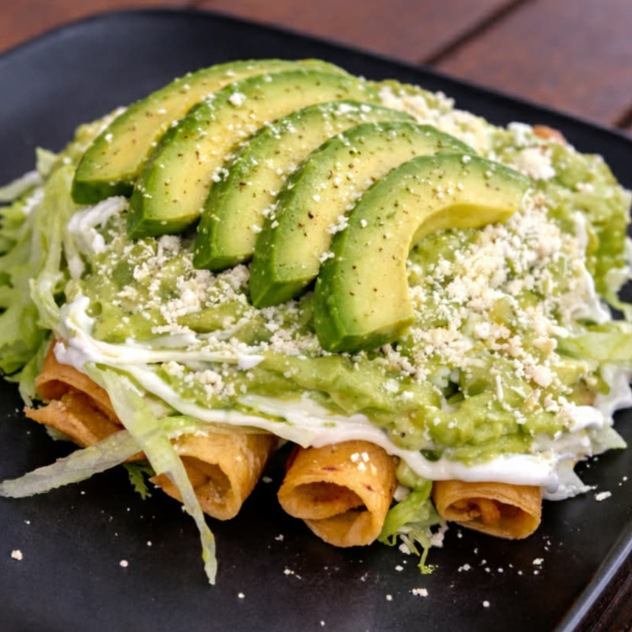Media docena de flautas de pollo, coronadas con crema, queso, aguacate y salsa.