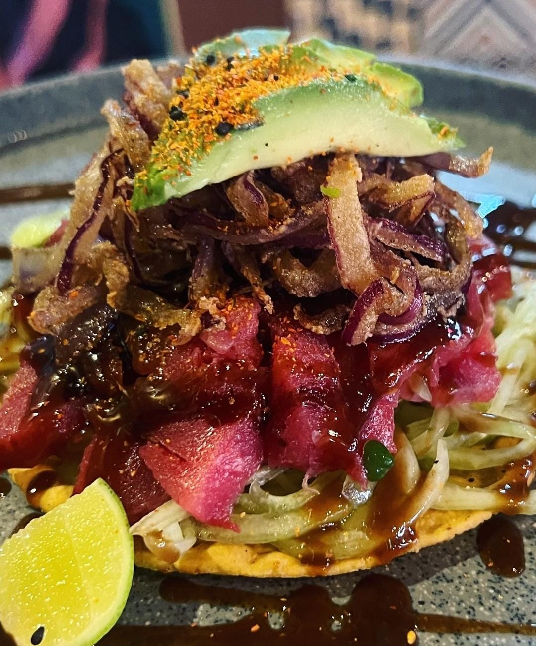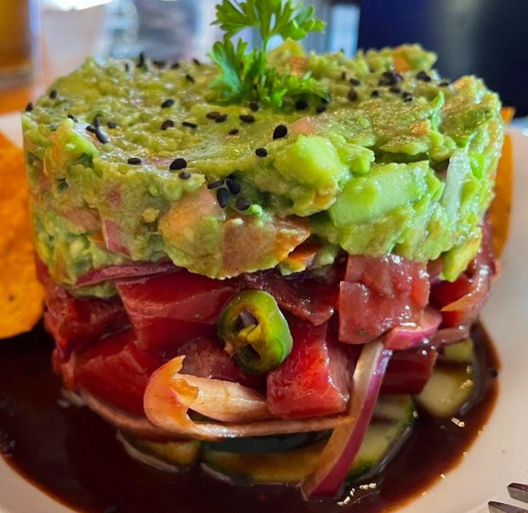 Deliciosa torre de atún salseada, pepino, cebolla morada, acompañada de aguacate molido
