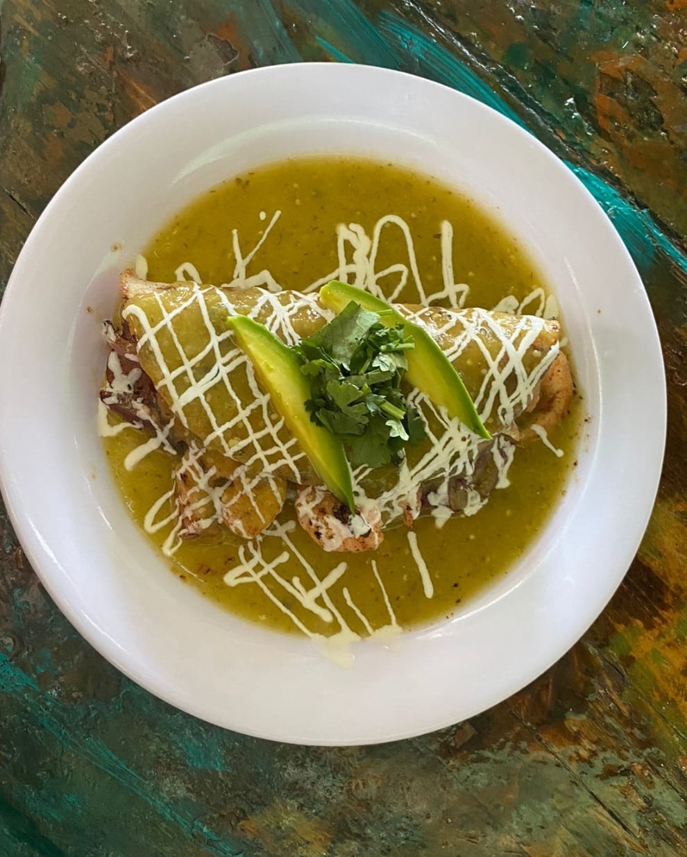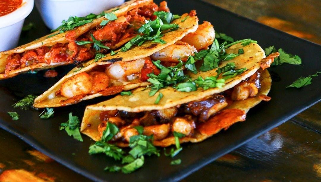 Tortilla de hariana, costra de queso, relleno de rico guiso de camarón con pulpo ahogado en salsa especial