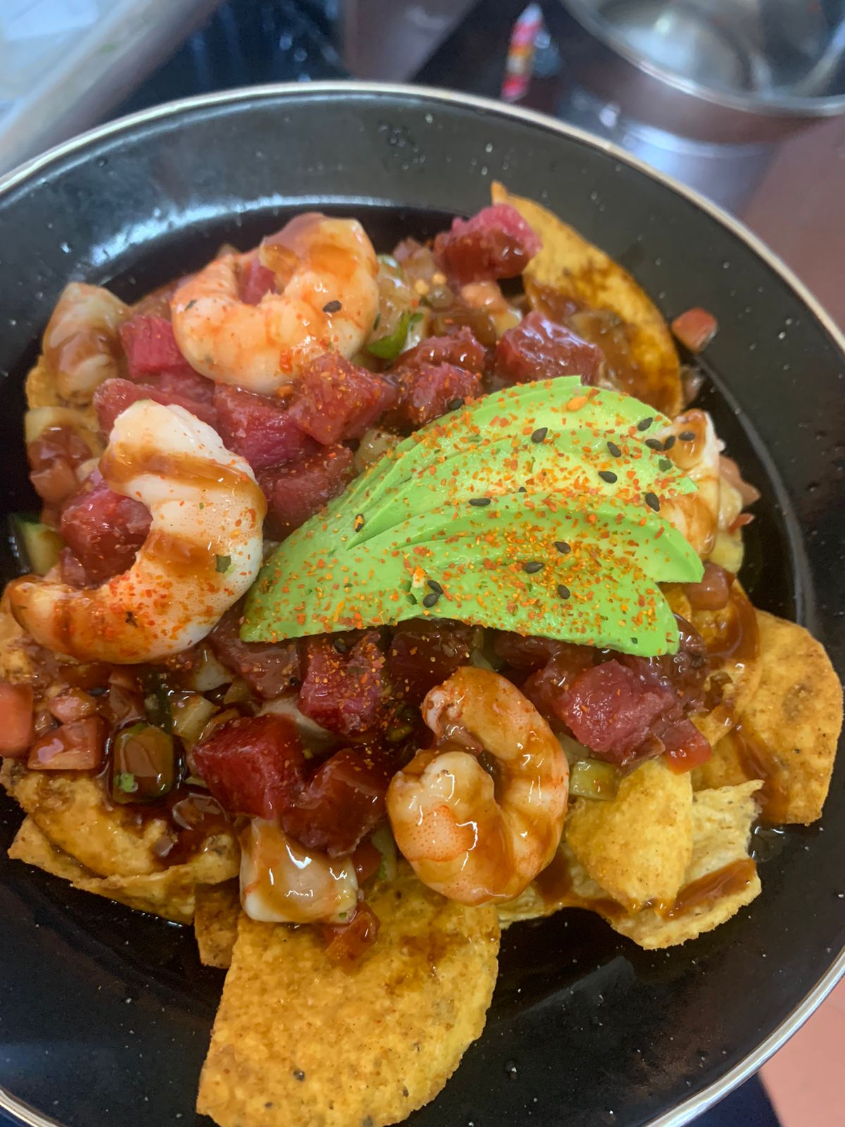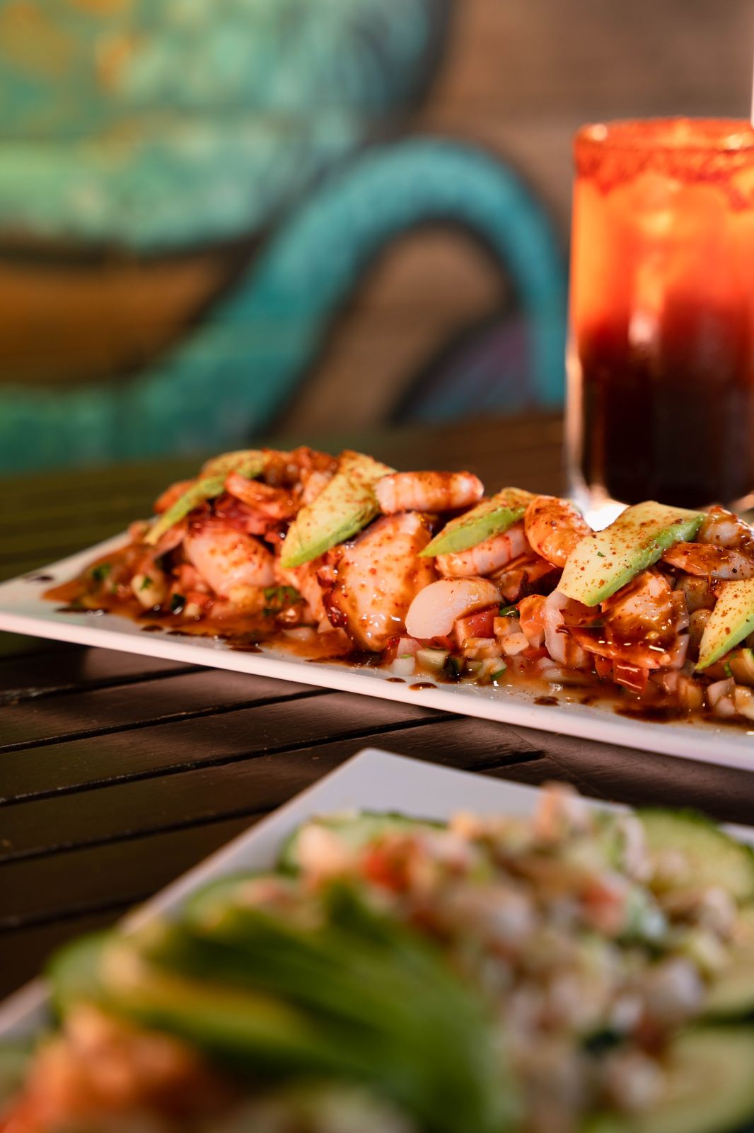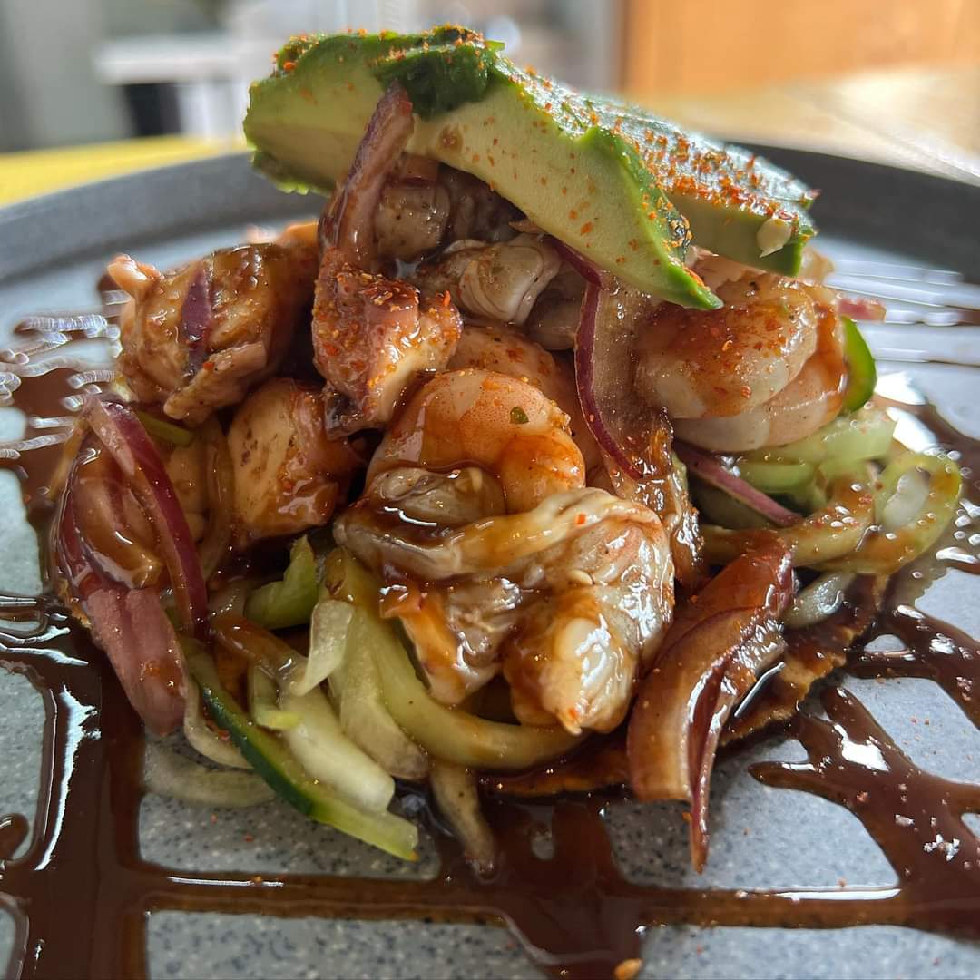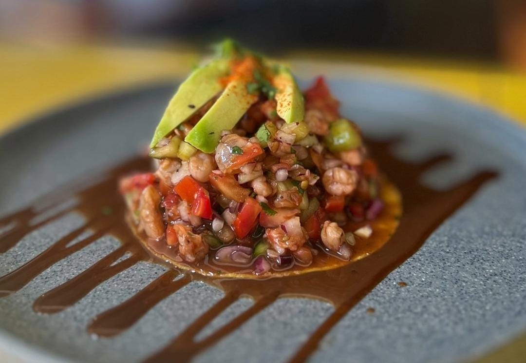 Deliciosa tostada compuesta de camarón cocido curtido, pulpo, aguacate salseada