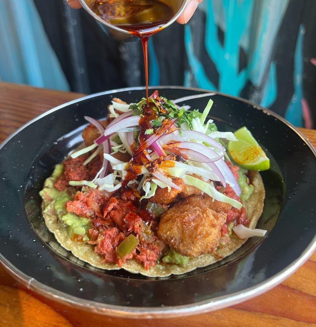 Tortilla de maiz a la plancha con guacamole, guiso de marlin y camarón empanizado