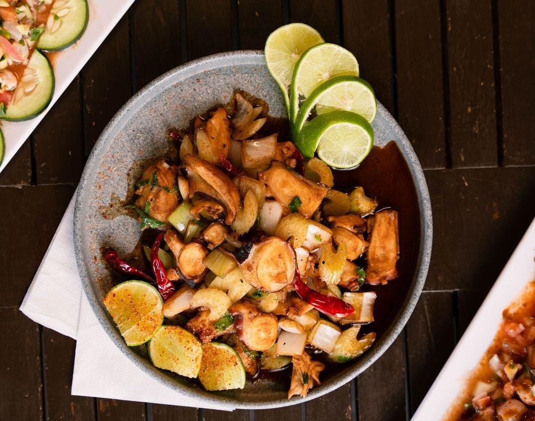 Rico pulpo salteado con cebolla, apio y chile de arbol, listo para botanear