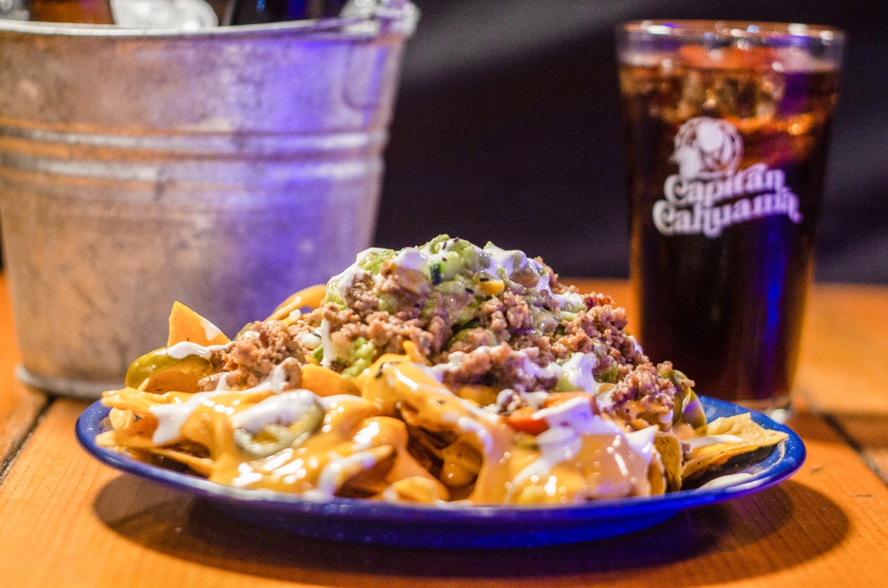 con carne, chicharrón, marlin, con salsa bandera, crema, queso amarillo, guacamole