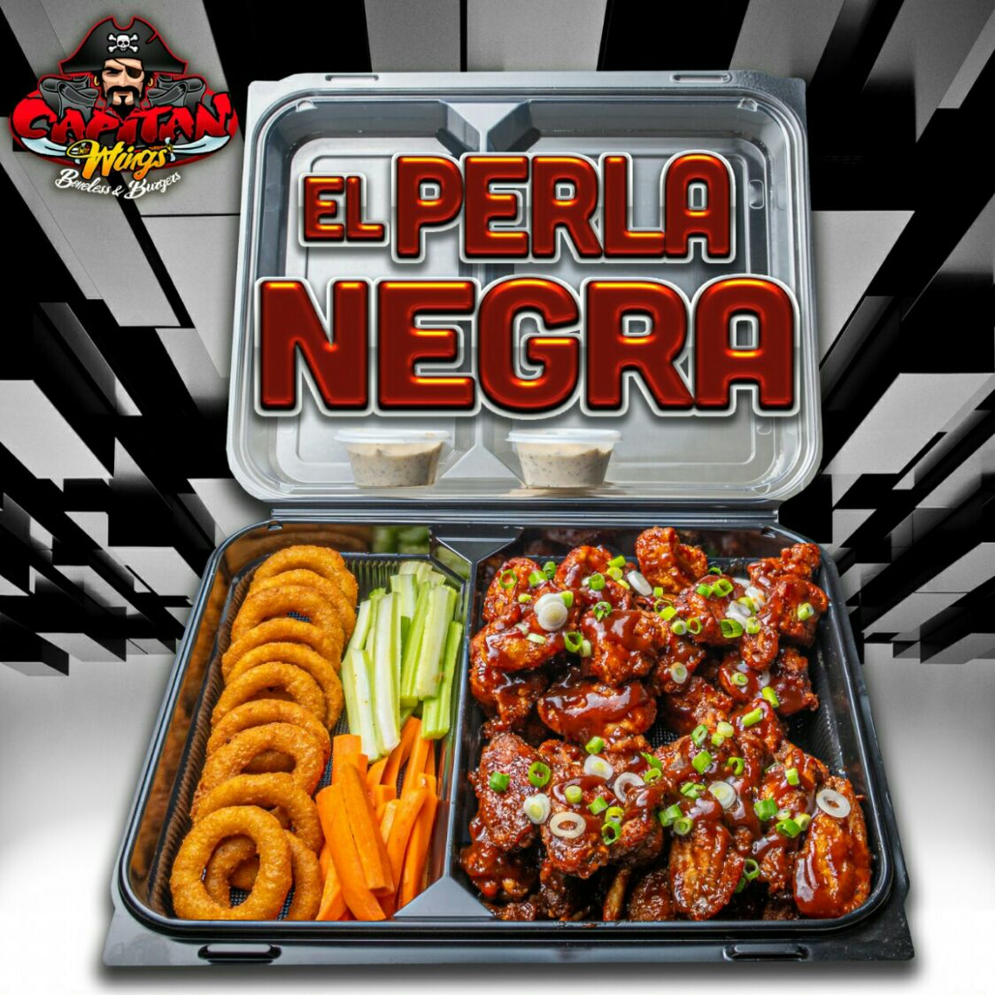1 Orden de alitas y 1 orden de boneless (bañados en ranch, cebollín y ajonjolí encima), 1 orden de aros de cebolla, 2 pz de ranch de la casa, apio y zanahoria.