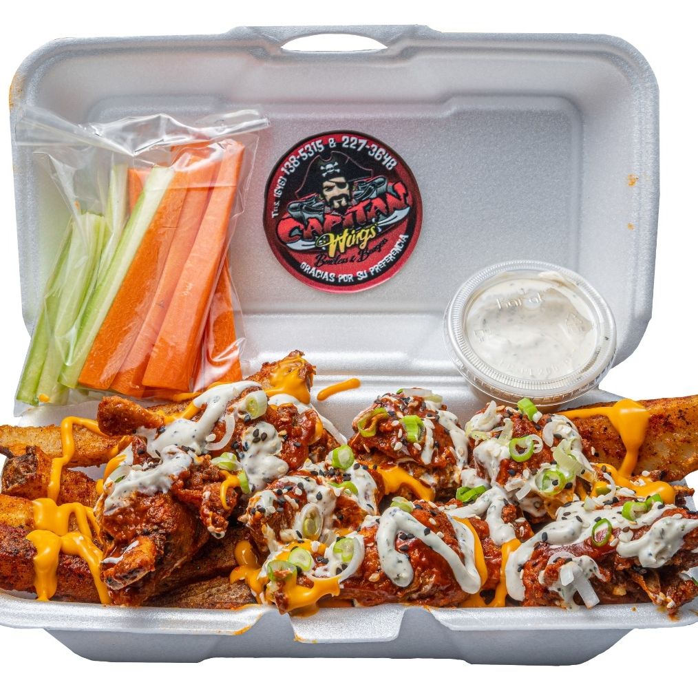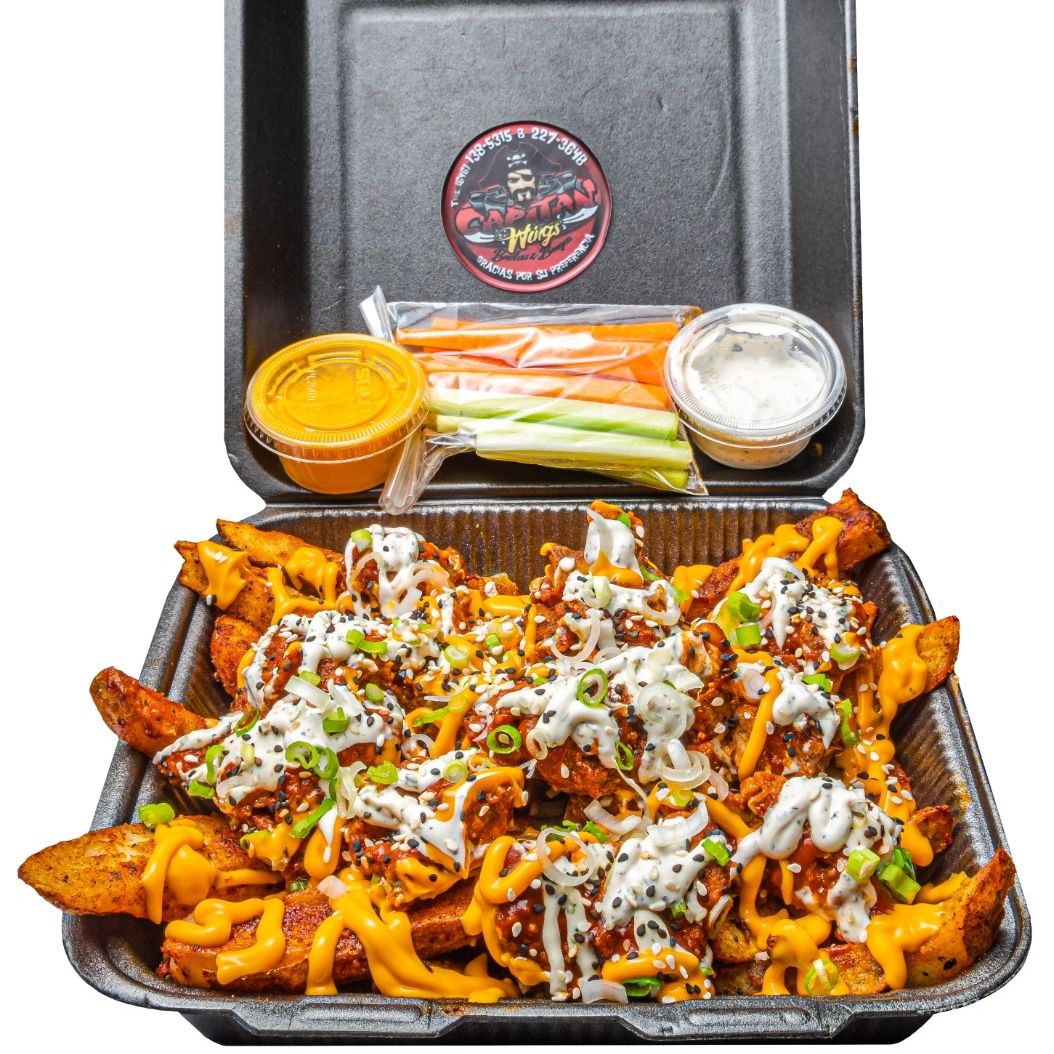 Cama de papas sazonadas bañadas con queso, encima cama de boneless ó alitas bañados con ranch de la casa, cebollín y ajonjolí esparcido.