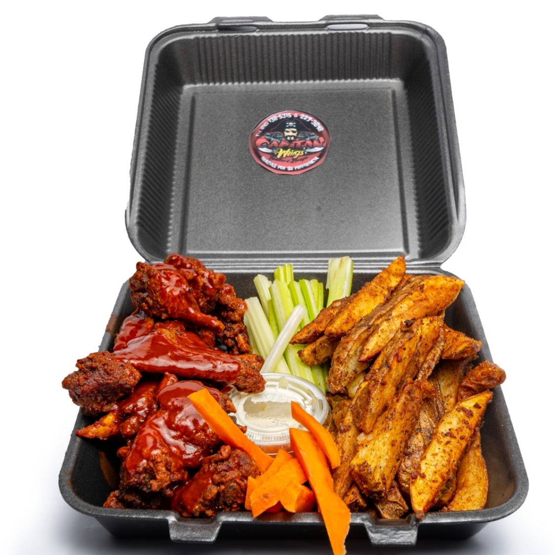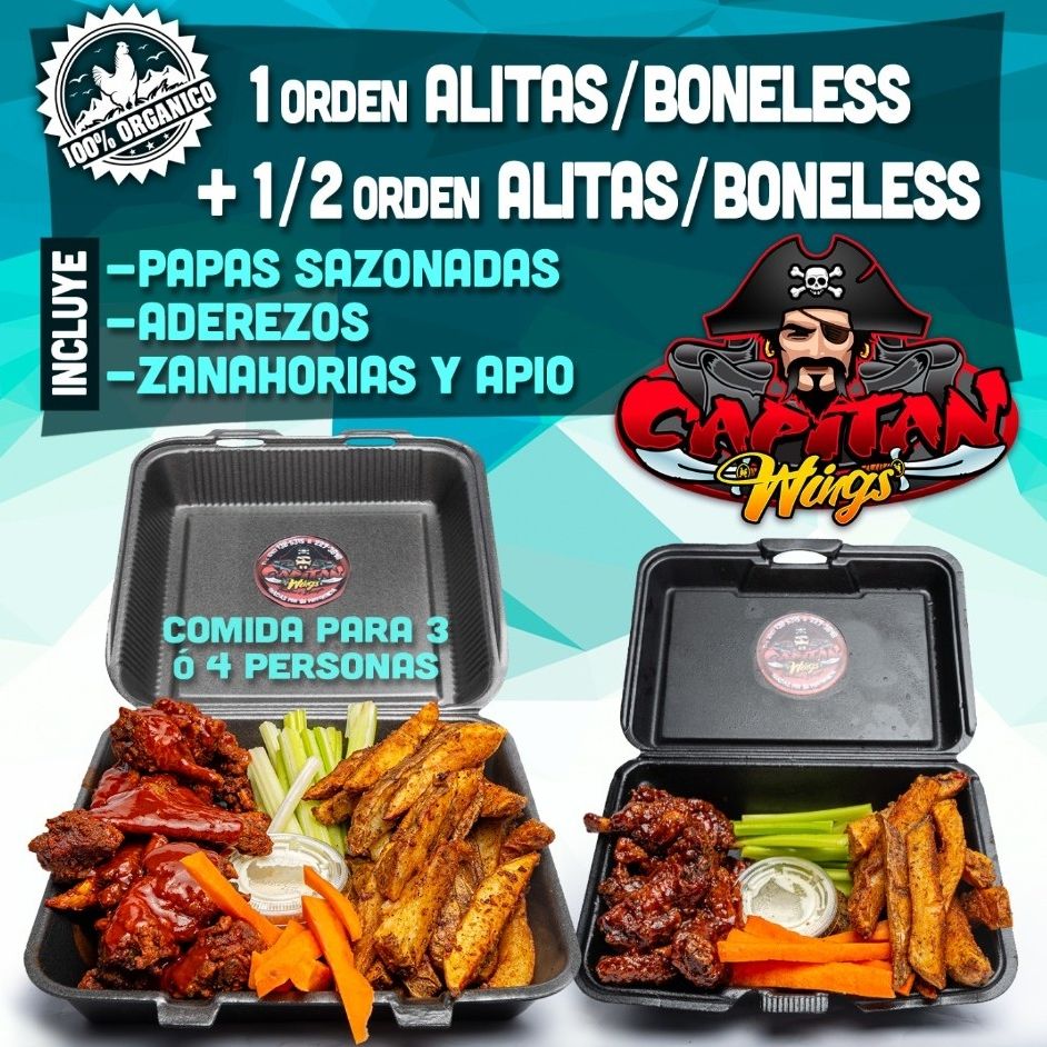 1 Orden y media de alitas o boneless (incluye papas sazonadas, 2pz de ranch de la casa, apio y zanahoria).