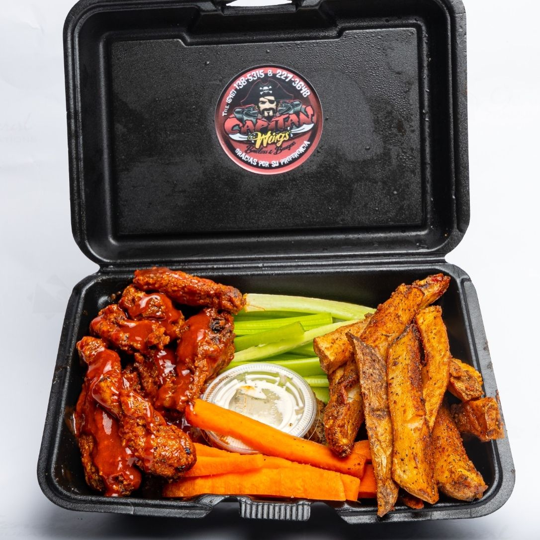 1 Orden y media de alitas o boneless (incluye papas sazonadas, 2pz de ranch de la casa, apio y zanahoria).