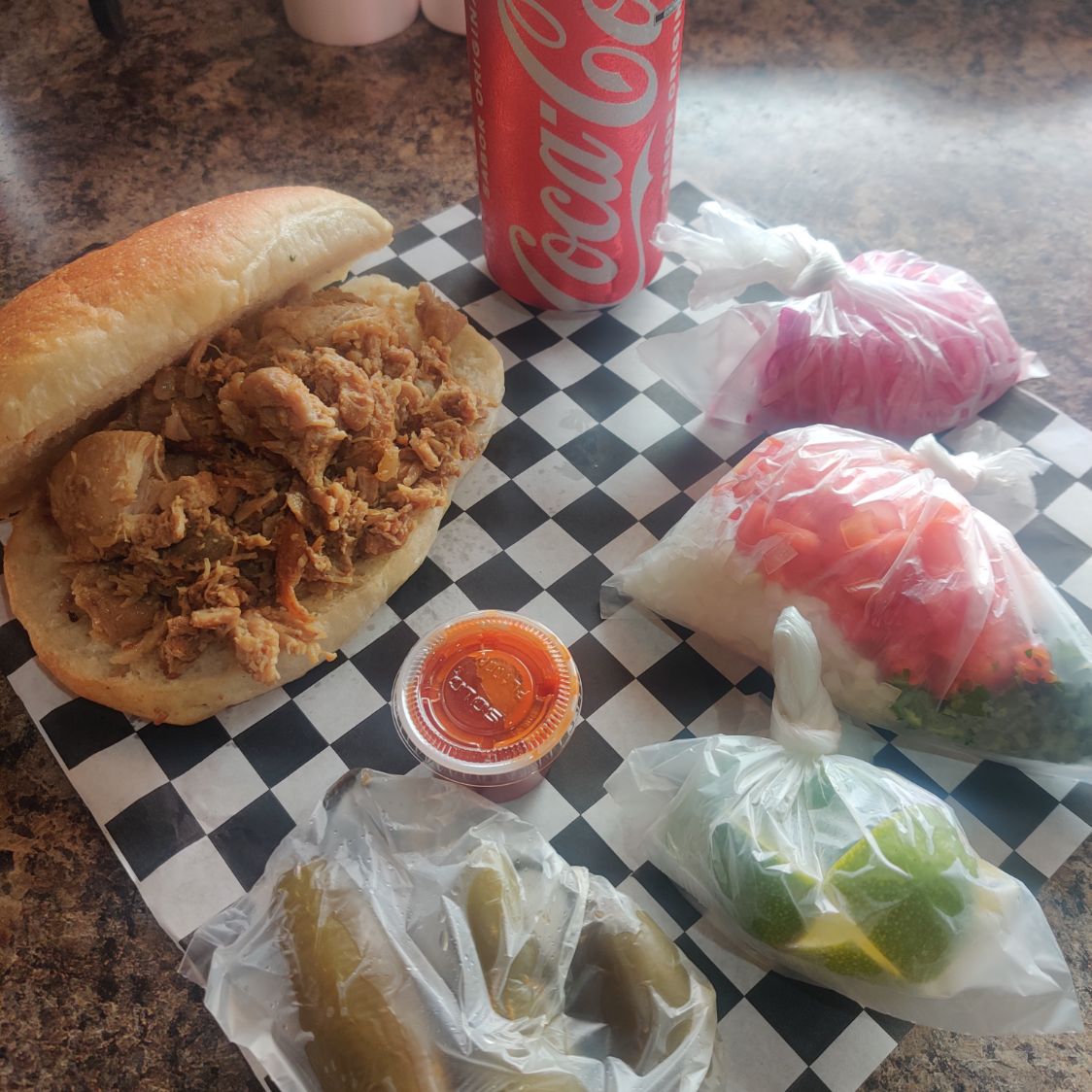 Incluye salsa bandera (tomate, cebolla, cilantro), cebolla curtida (cebolla morada), limones, chiles jalapeños, salsa, salsa de la casa (chipotle) y tortillas.