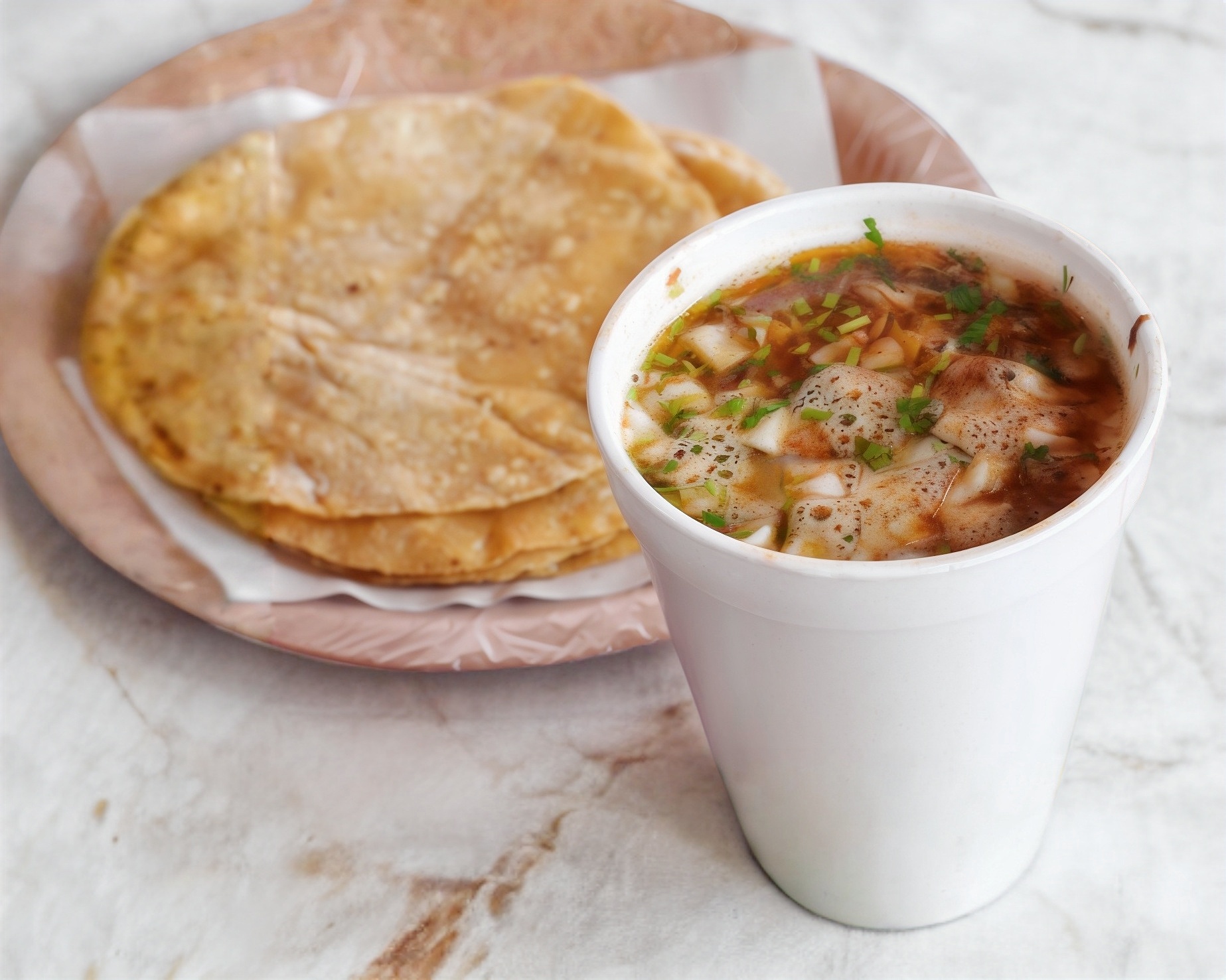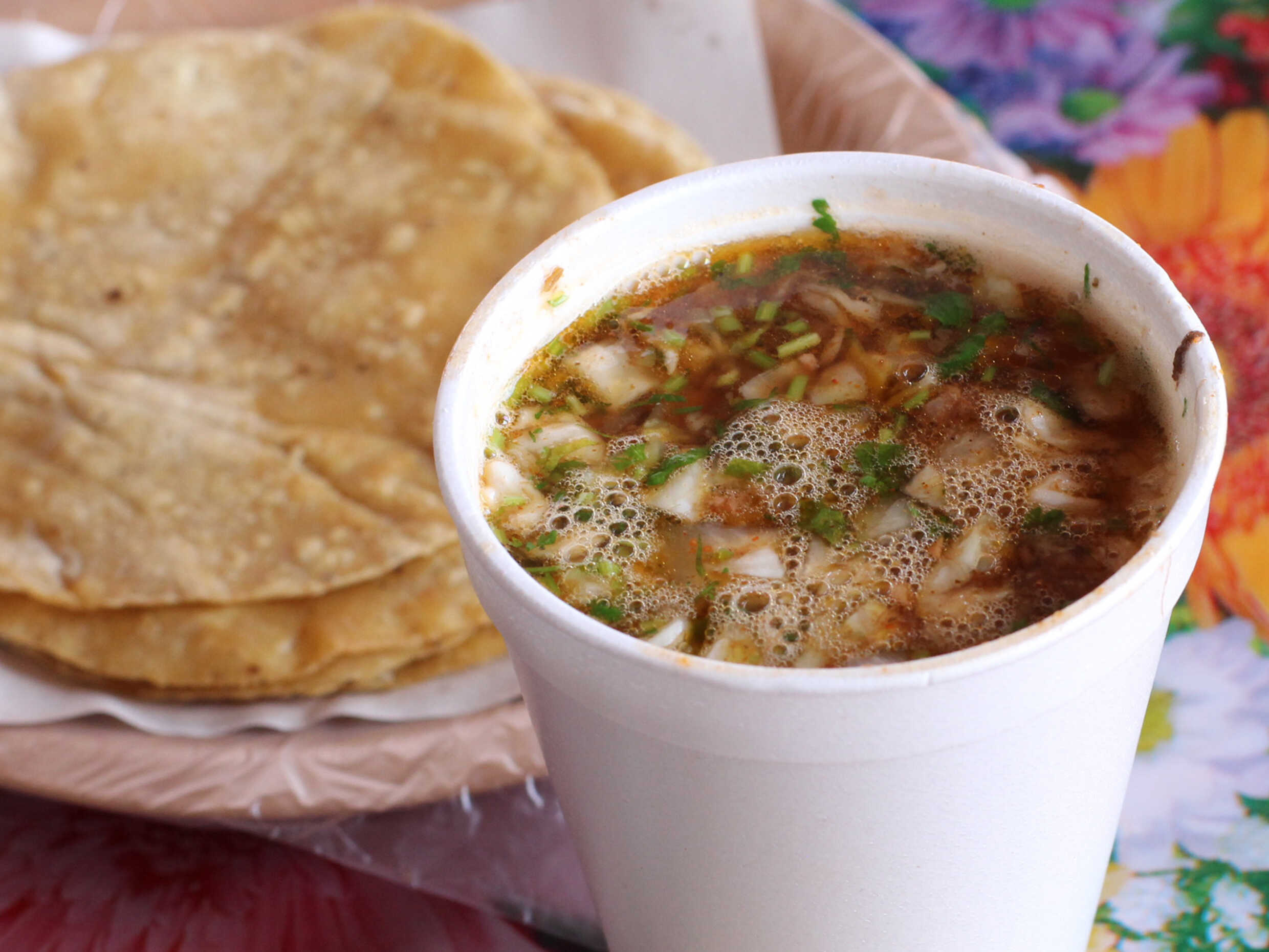 Vaso de birria con carne y frijol