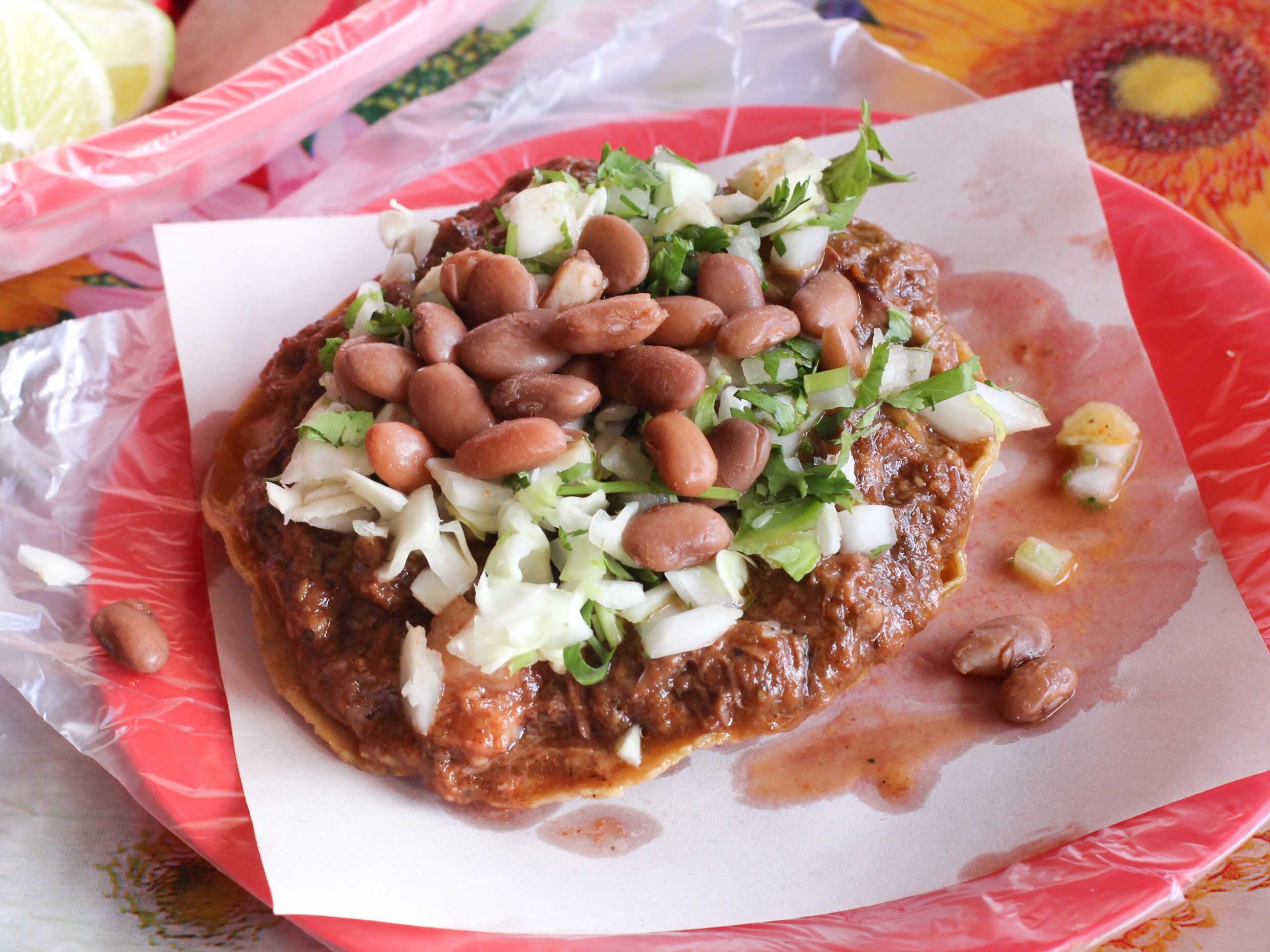 Tostada de birria con verdura yfrijoles
