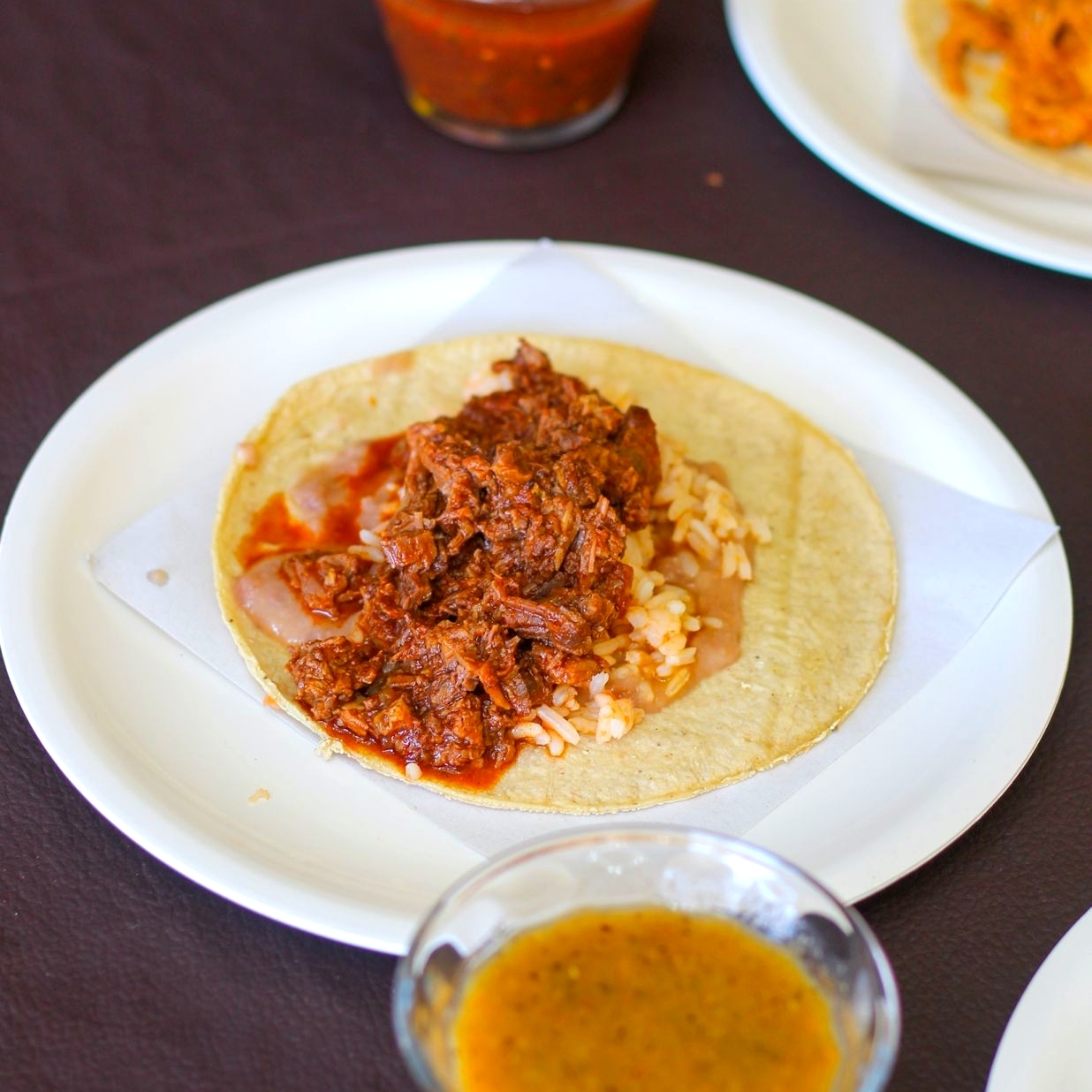 Tacos de chicharrón rojo*1 + Taco de alambre de res*1 + Taco de cochinita pibil*1 + Refresco*1
