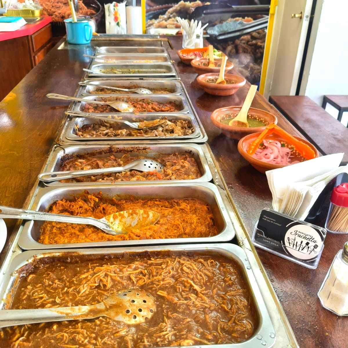 Pollo con mole, birria, cochinita pibil, chicharrón rojo, chicharrón verde, alambre de res