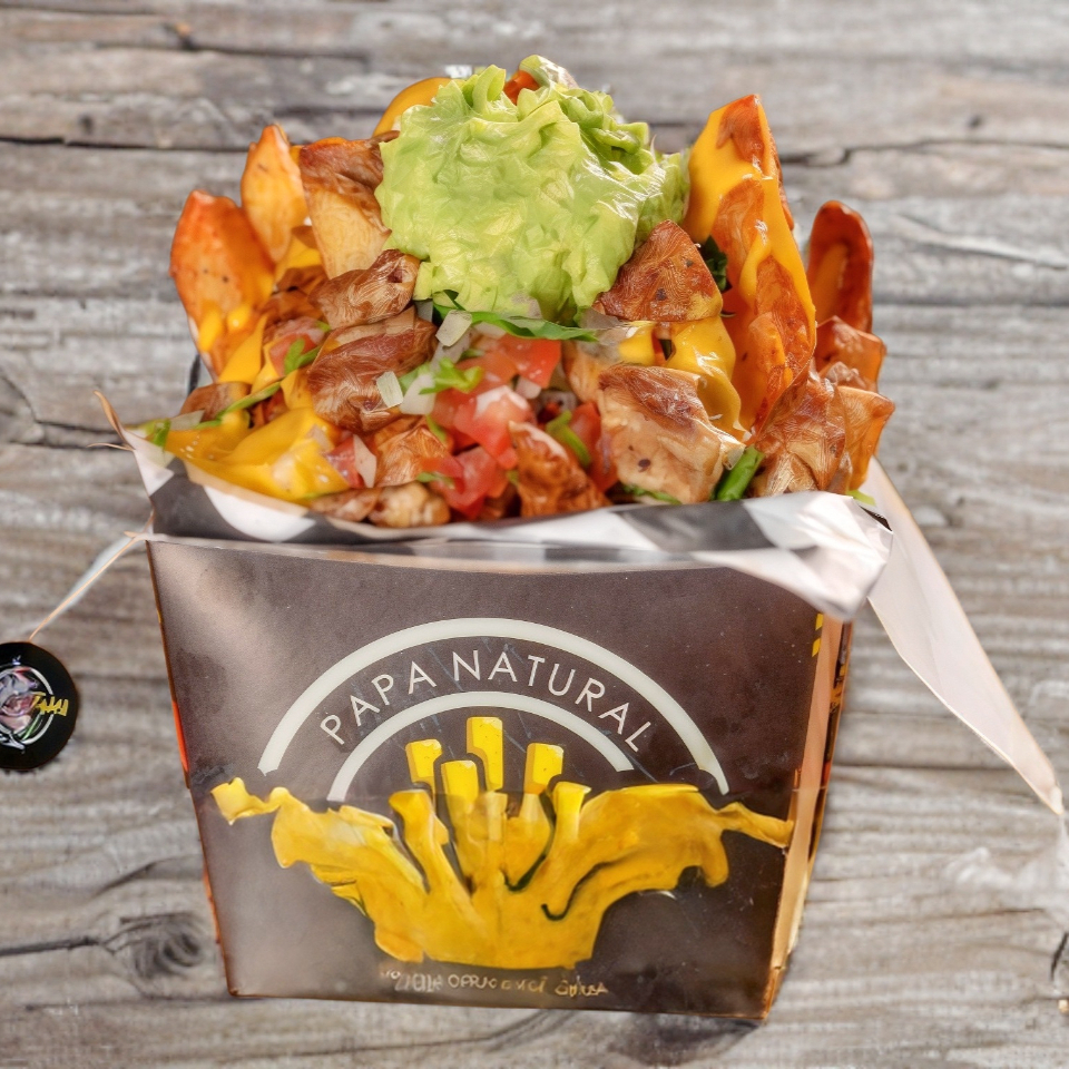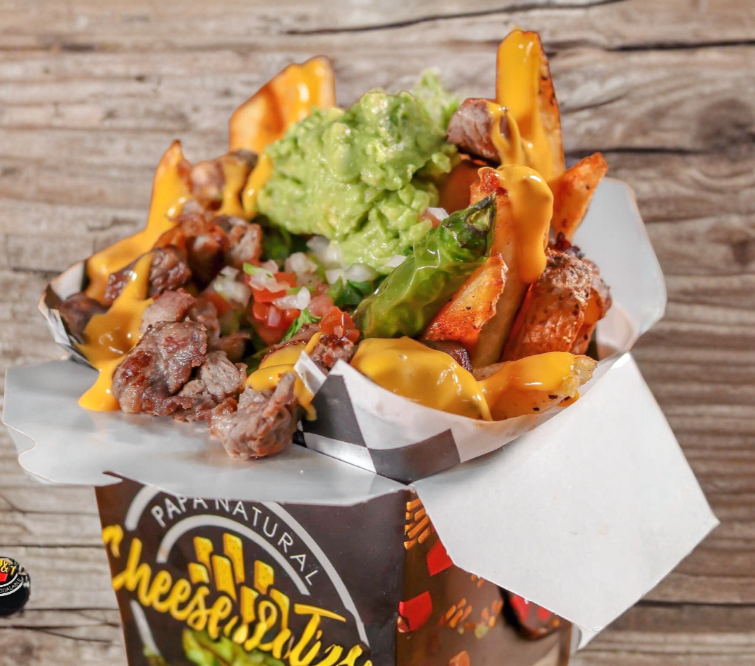 PAPAS NATURALES bañada en queso CHEDDAR, con 300GRM de arrachera PREMIUM, pico de gallo y guacamole.
