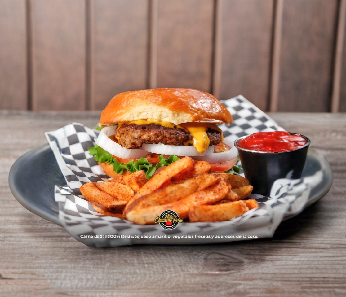 Deliciosa Hamburgesa de calidad, contiene pulled pork, dos carnes 100% Sirloin Prime Angus, aros de cebolla, tocino ahumado, queso suizo, queso americano, acompañado de papas a la francesa sazonadas y con queso cheddar arriba.