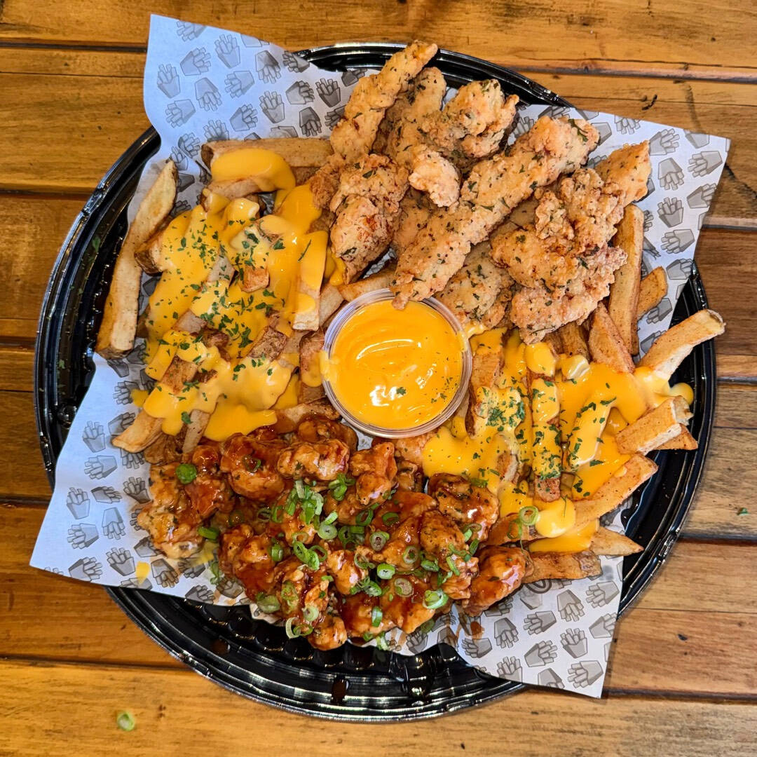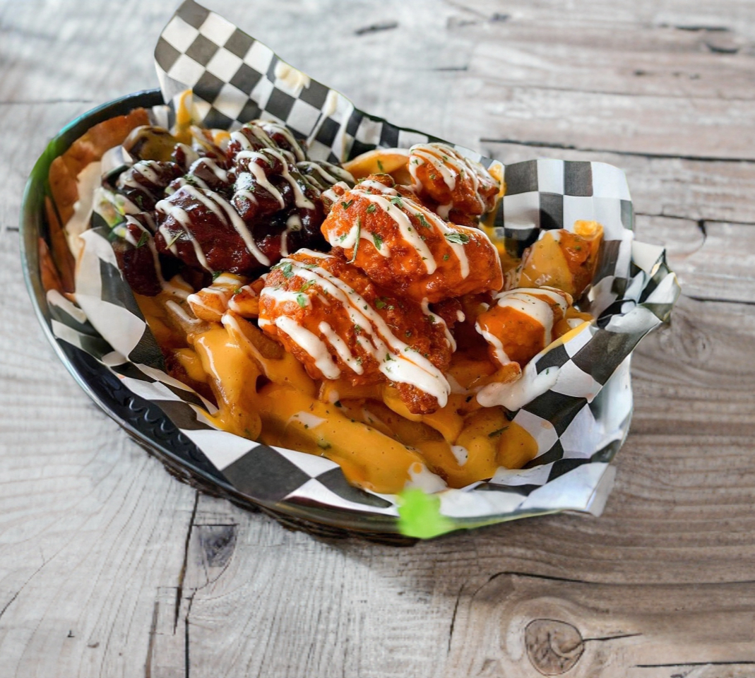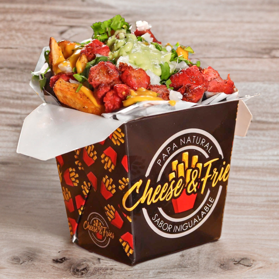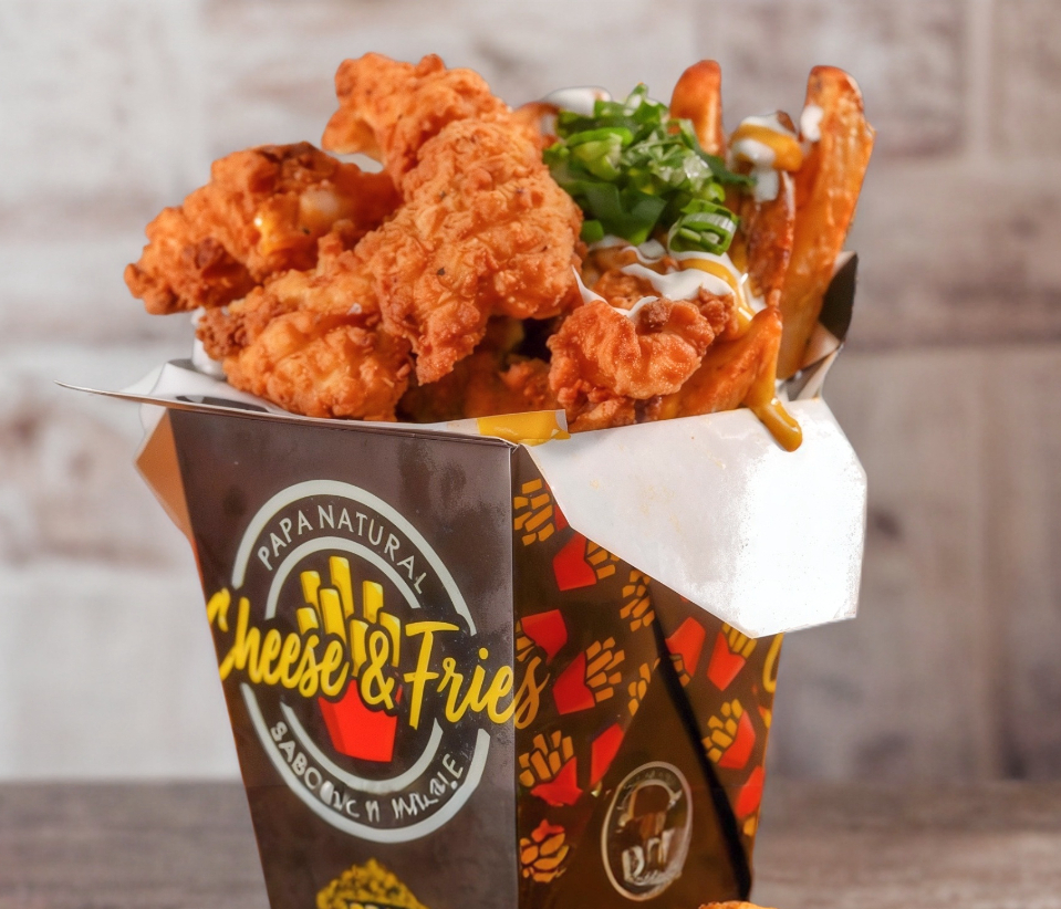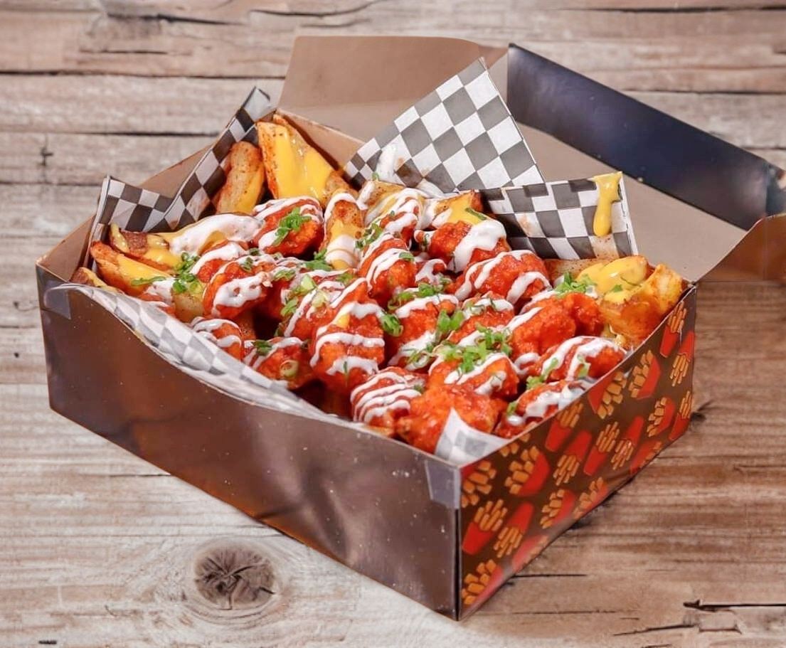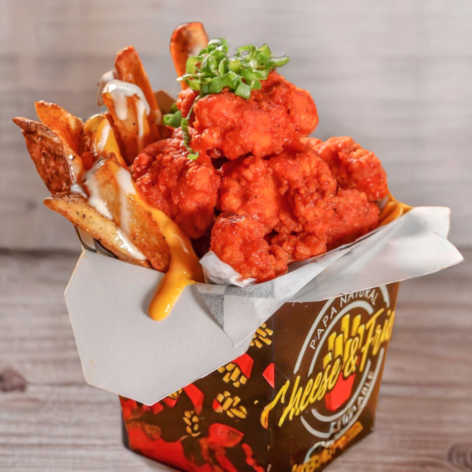 Porción individual: cama de papas a la francesa bañadas en queso de la casa, con boneless (aprox. 150 g de pechuga de pollo) cubiertos con la salsa de tu preferencia.