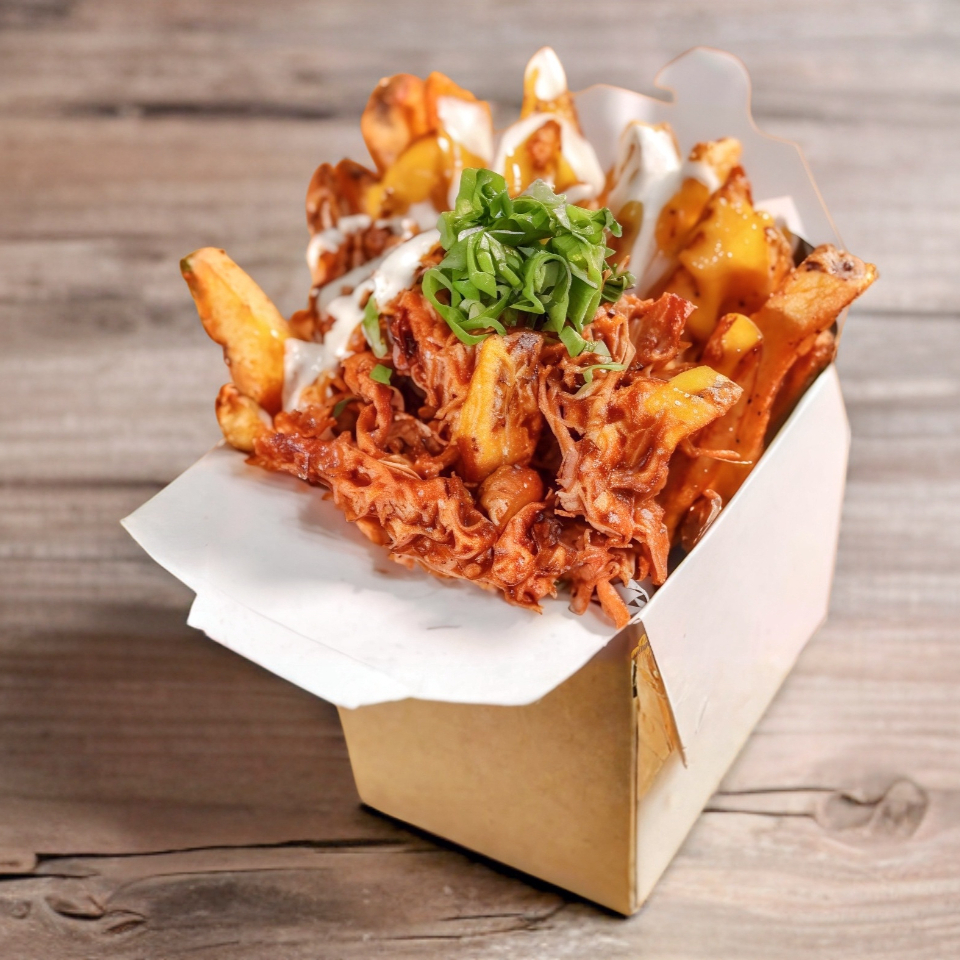Cama de papas, bañadas en queso de la casa, con 300 grms de jugoso pulled pork