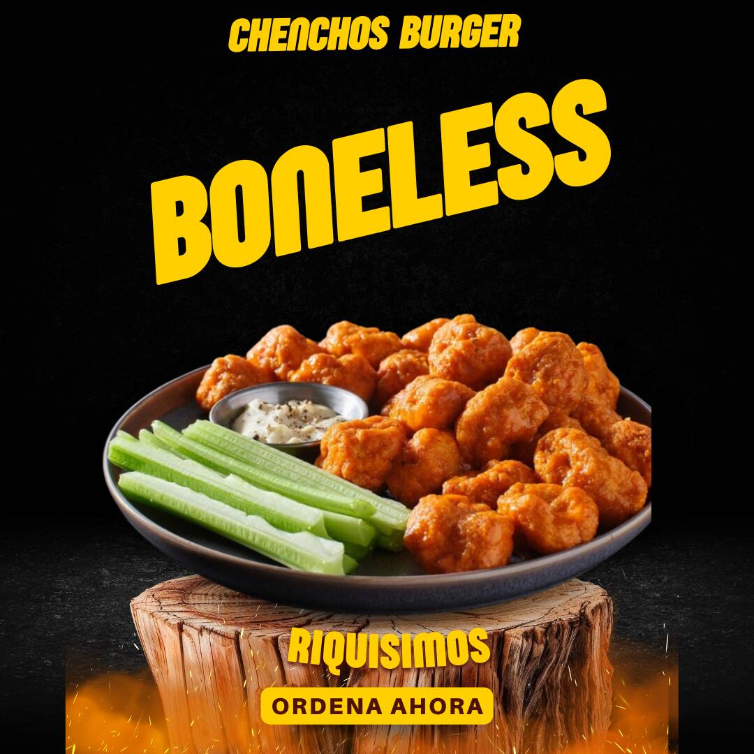 Boneless de pechuga de pollo bañadas en salsa de tu elección: bbq, buffalo o naturales. Acompañado de apio, zanahoria y aderezo ranch.