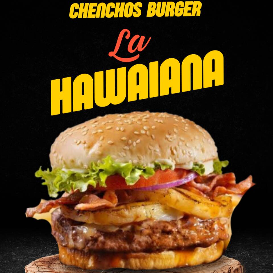 Carne de res, piña, jamón, tocino, bbq, queso amarillo, verduras y aderezos. Incluye papas y soda.