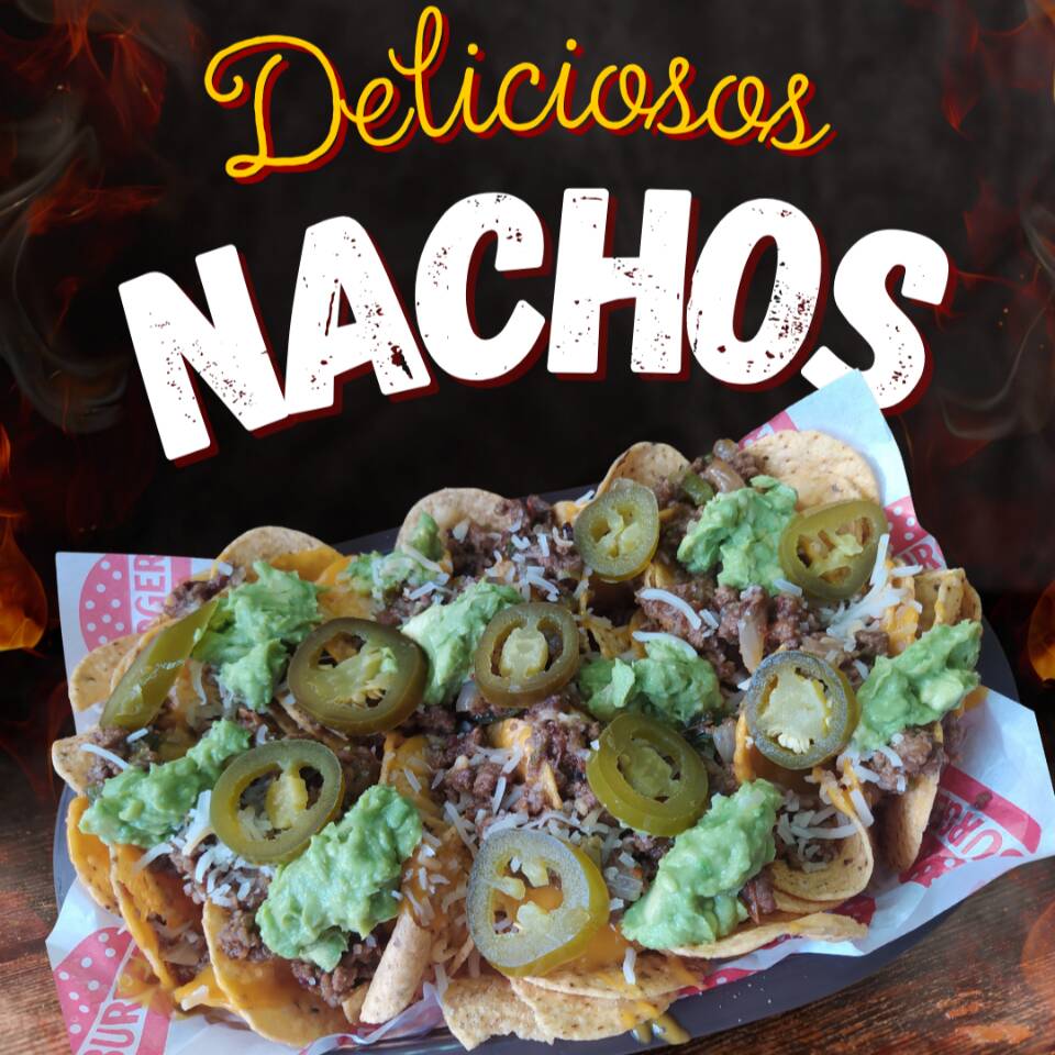 Totopos bañados en queso de nachos, carne molida, aguacate, jalapeños y queso rallado.