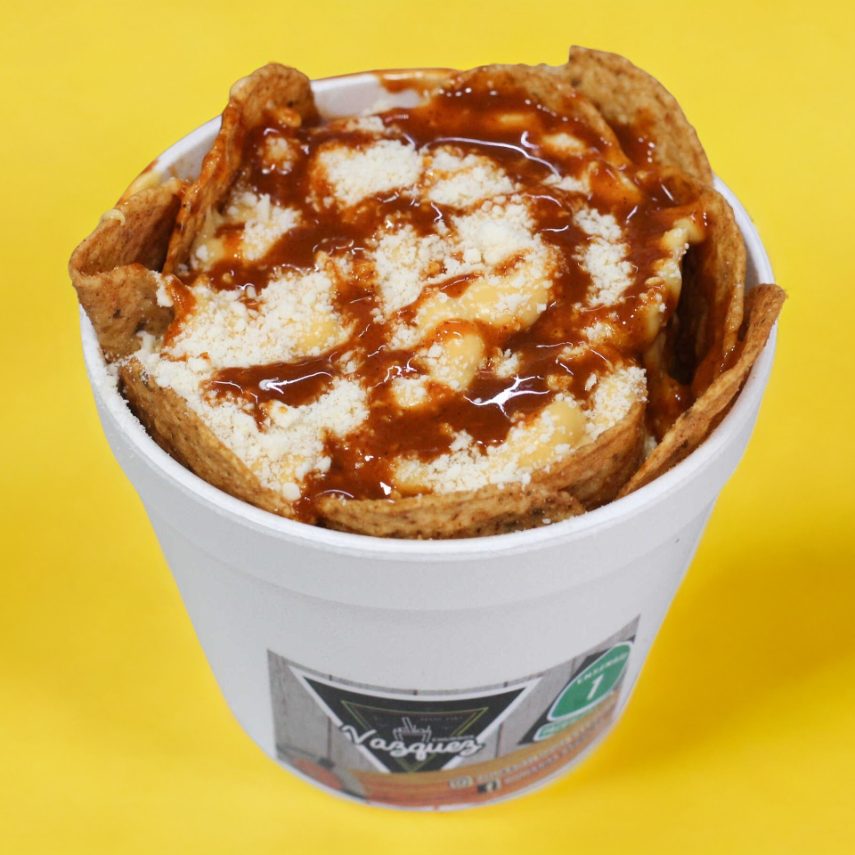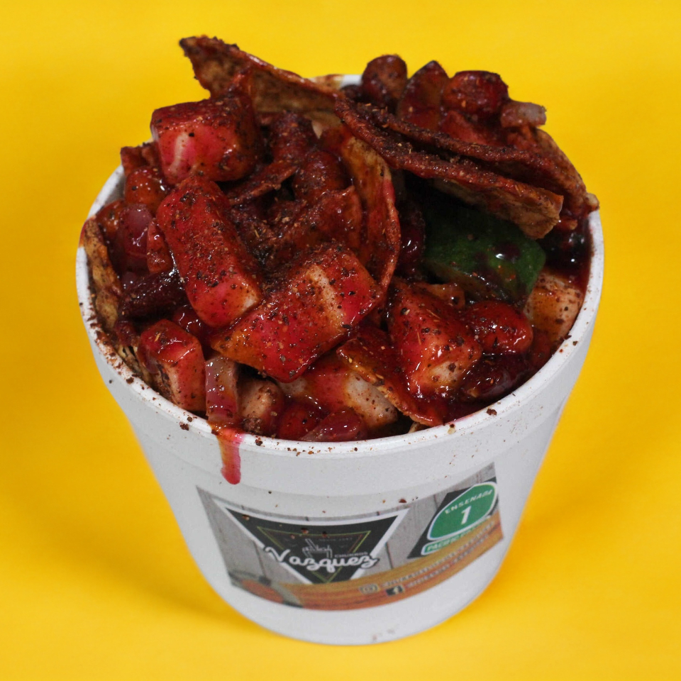 Tostitos, cacahuates, jícama, pepinos, cueritos, rielito, salsa de la Casa, chamoy, limón y Clamato.
