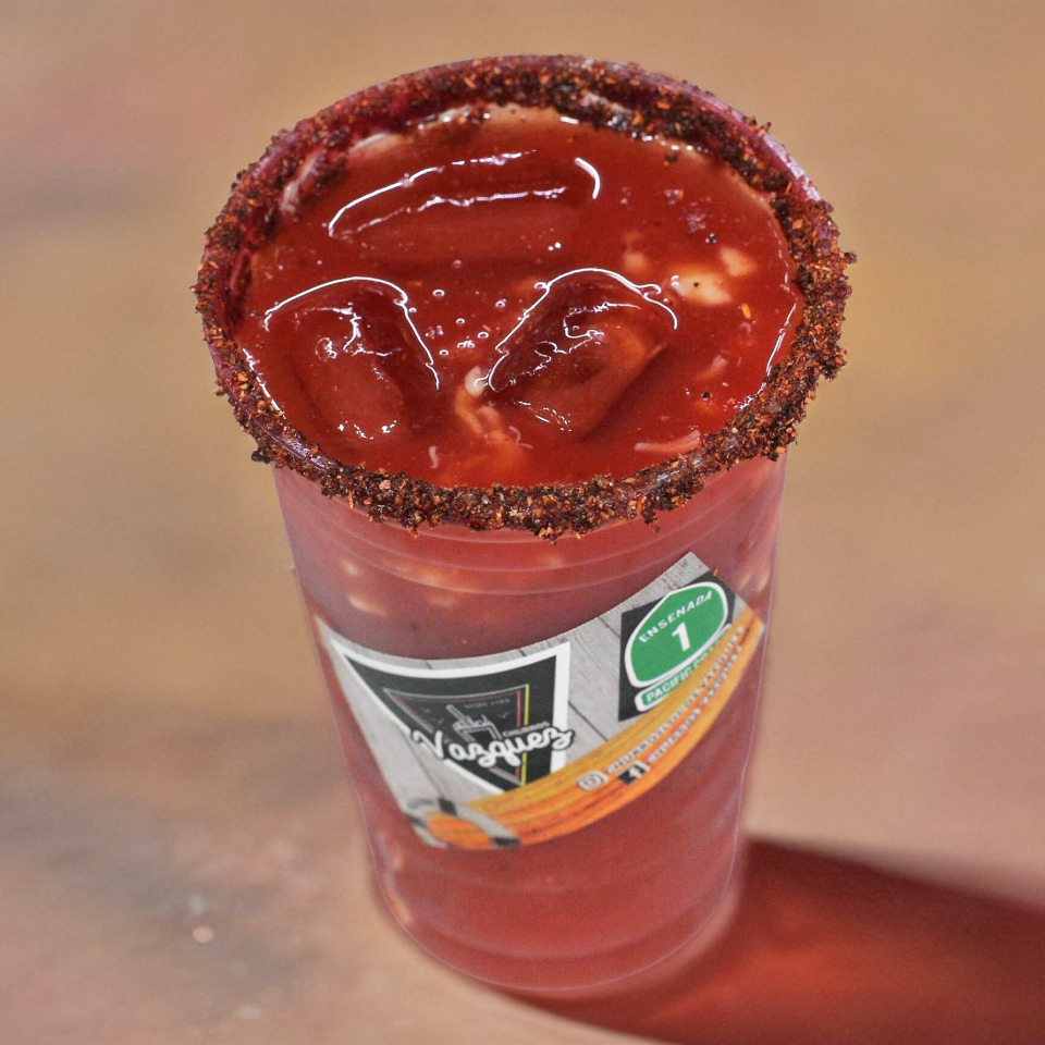 Clamato, sal, apio, salsa tabasco, salsa inglesa, limón y hielo. (24 onz)