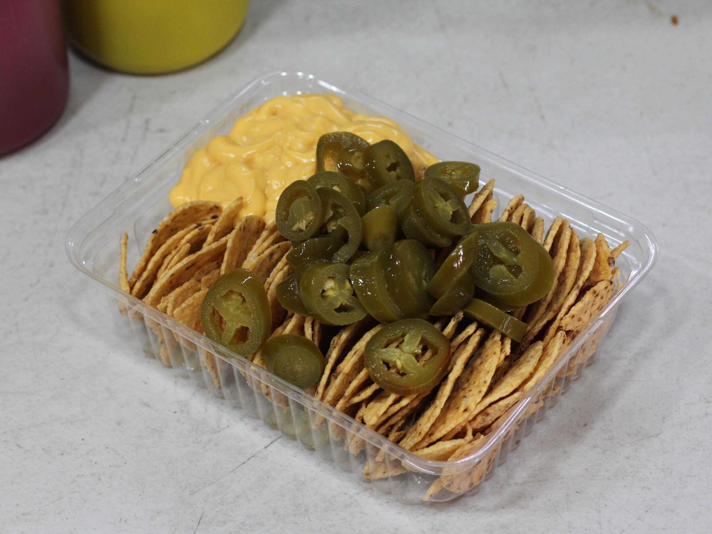 Totopos, queso amarillo y jalapeños.