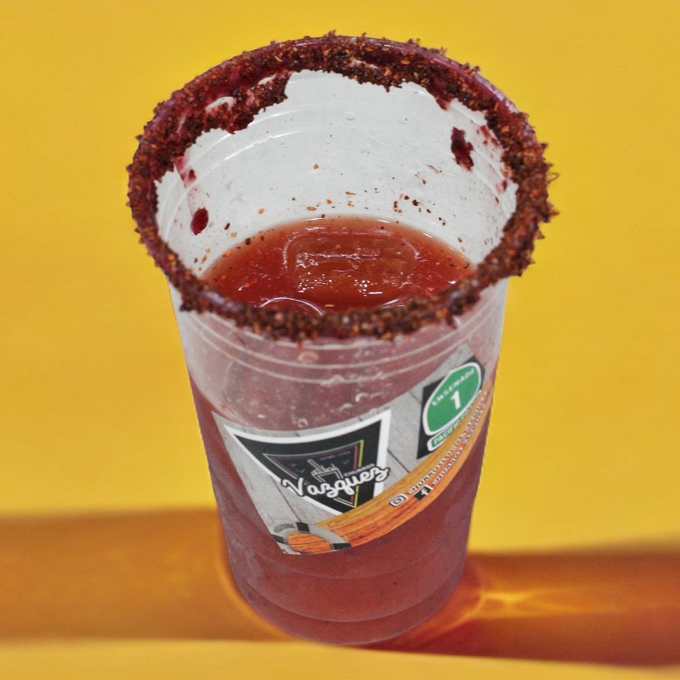 Clamato, salsa inglesa, chilito de la Casa, limón y hielo.