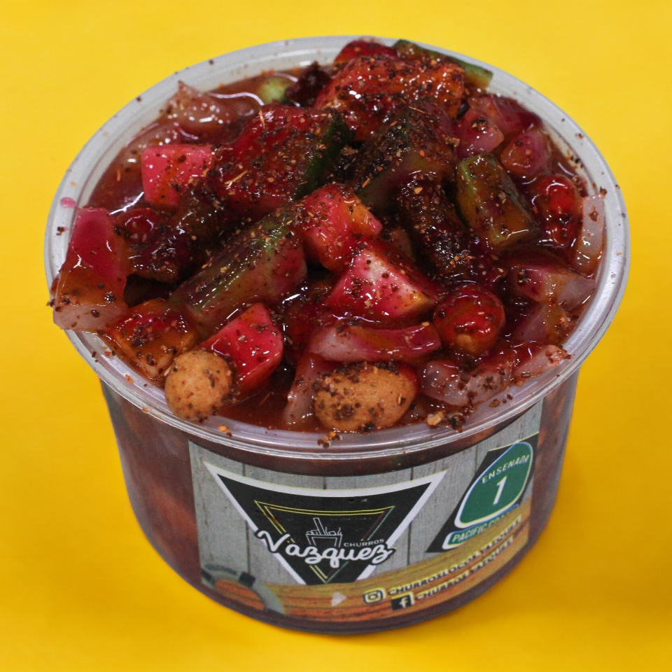 Churros, pepinos, jícama, cueritos, cacahuates, rielito, salsa, chilito de la Casa, chamoy saladito, limón y Clamato.