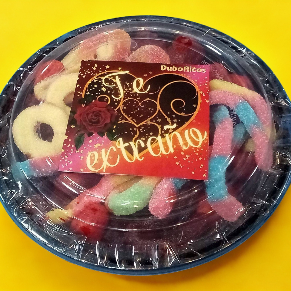 Gomitas de sandía, gusanito, manguito, naranjita, arito de durazno con chile aviento, gusanito neón y arito de durazno azucarado.